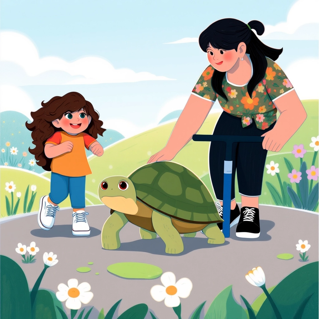 Further down the trail, [Mia](S3VJHYMS) met [Sammy the Turtle](PB9J5HDM). He was trying to cross to the other side of the bike path. 'Let’s help him, [Mom](B3NPSKCK)!' [Mia](S3VJHYMS) said. They carefully guided Sammy across, and he gave them a slow but grateful nod.