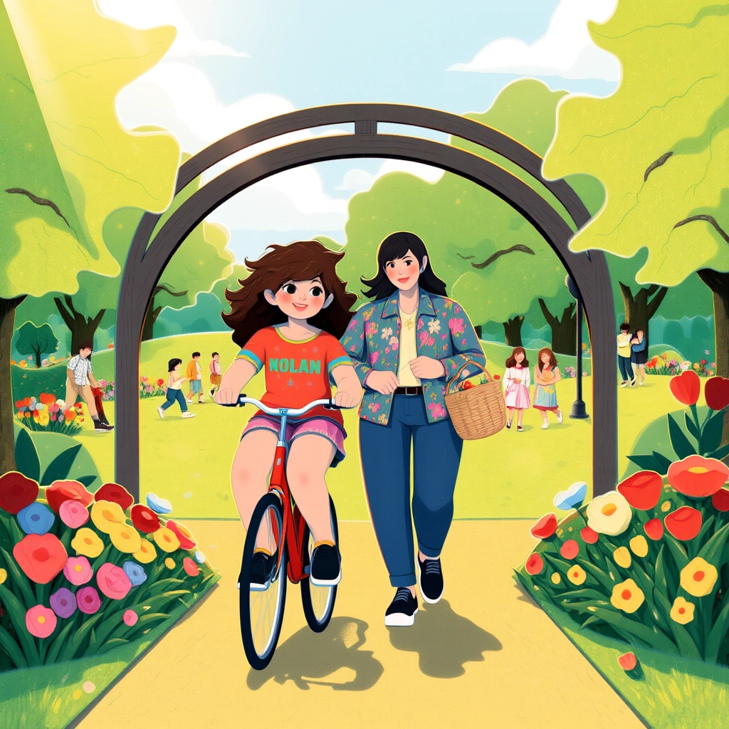 [Mia](S3VJHYMS) and her mom packed a picnic and headed to the park. [Mia](S3VJHYMS) couldn't wait to try the colorful bike trails she'd seen before. She loved the flowers lining the path and wondered if she’d find a new adventure today.