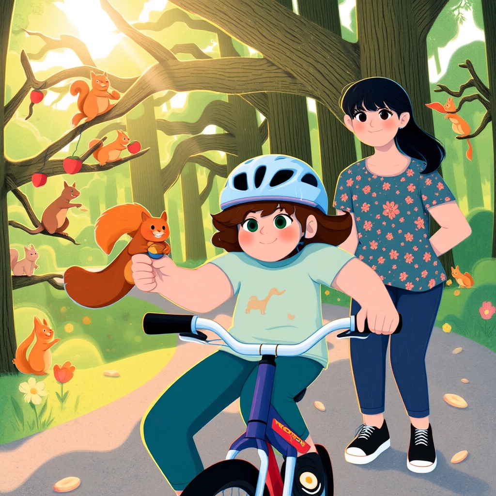 As [Mia](S3VJHYMS) started riding on the trails, she noticed a lively squirrel darting across the path. 'Look at that squirrel, [Mom](B3NPSKCK)!' she called out. The squirrel paused, holding a tiny acorn in its paws, as if inviting [Mia](S3VJHYMS) to play.