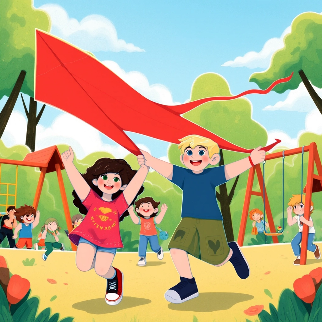 [Mia](S3VJHYMS) biked to the playground, where she saw her friend [Jake](CM9VJSCZ) flying a bright red kite. 'Want to join?' [Jake](CM9VJSCZ) asked. [Mia](S3VJHYMS) parked her bike and ran to grab the kite's string, laughing as it tugged in the breeze.
