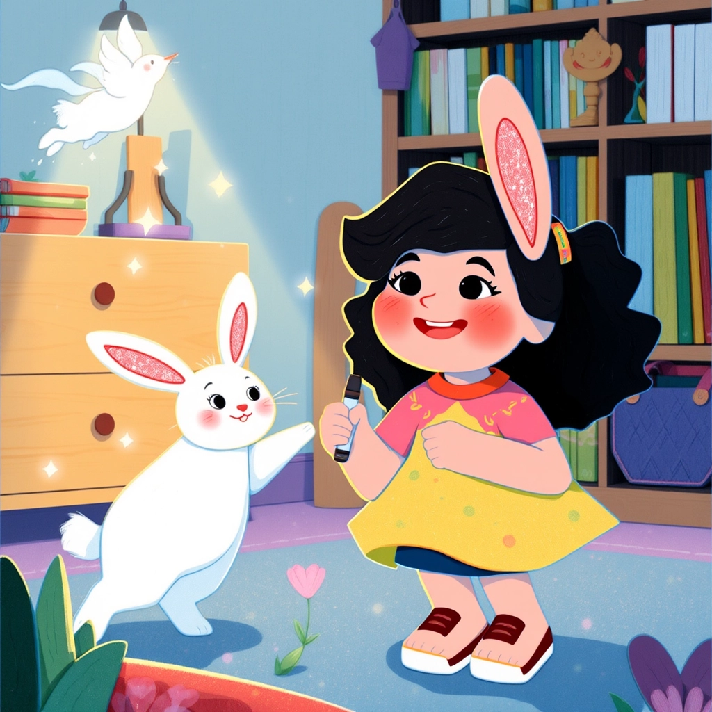 Out of the sketchpad hopped a bunny with fluffy white fur and a pink nose. It wiggled its ears and said, 'Thank you for drawing me, [Mia](S3TTPBKB)! This garden is amazing!'