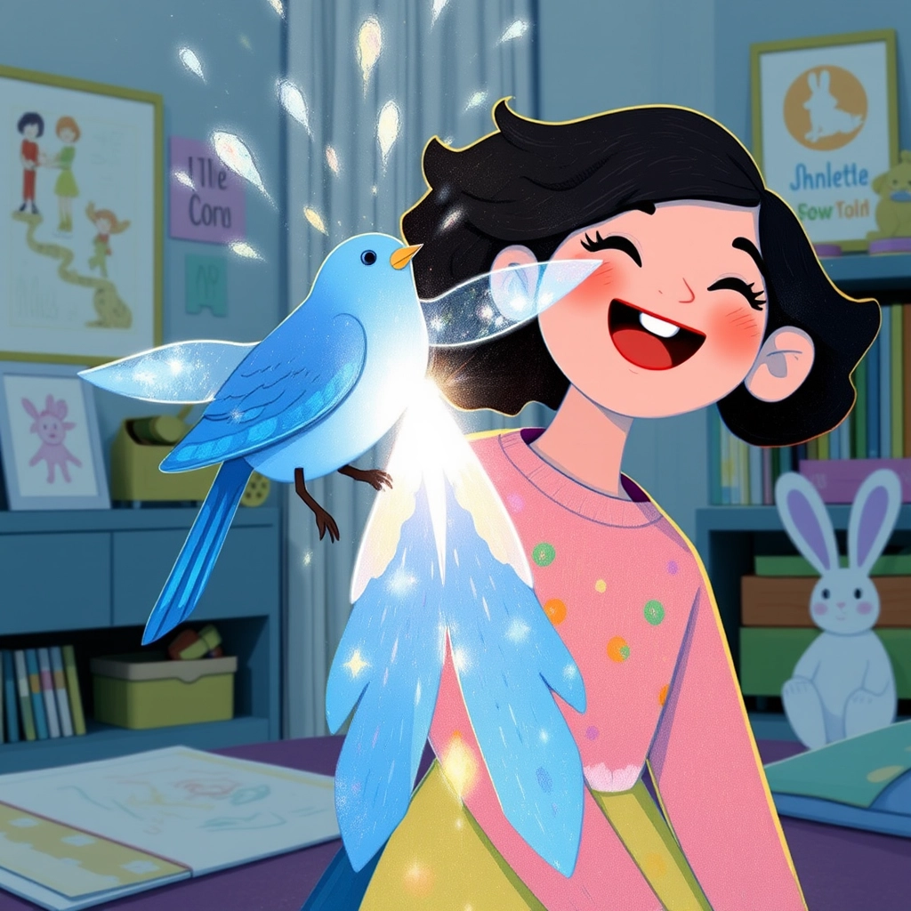 Next, a chirpy bluebird fluttered out, landing right on [Mia](S3TTPBKB)’s shoulder. 'This is the prettiest garden I could ever live in!' chirped the bird.