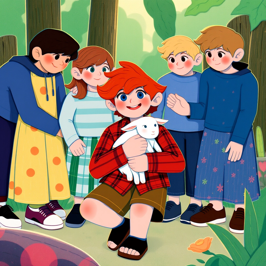 Last was [Sam](XMVVPTPC), a cheerful boy with wavy red hair, who always brought his pet lamb, Snowflake, along for every adventure.
