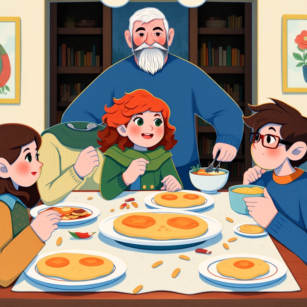 As the evening went on, [Ben](F46YPTPX)’s dad brought out a tray of golden latkes and creamy applesauce. It was [Mia](R7QZVSJ3)’s first time tasting them. “Yum!” she said with wide eyes. “These are amazing!”