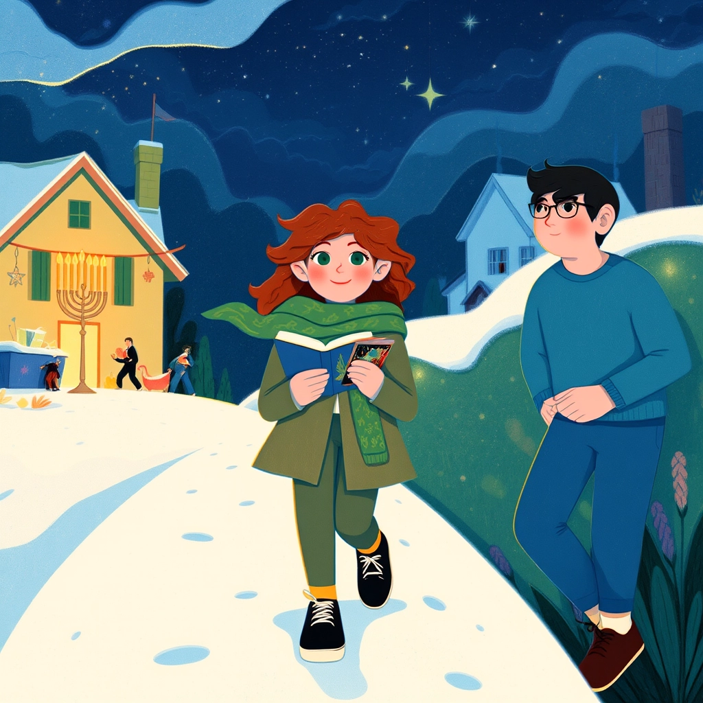 As the snow fell quietly outside, [Ben](F46YPTPX)’s family sang songs in Hebrew. [Mia](R7QZVSJ3) joined in, humming along with everyone. It felt happy and peaceful. "I’m so glad I got to be part of this," [Mia](R7QZVSJ3) whispered to [Aisha](K7BVBZW4).