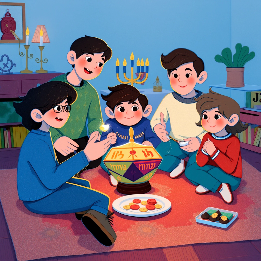 [Ben](F46YPTPX)’s mom handed everyone a dreidel and explained the rules of the game. "We use a special spinning top, and the letters on it remind us of the miracle," she said. Everyone took turns spinning, cheering when they won chocolate coins!