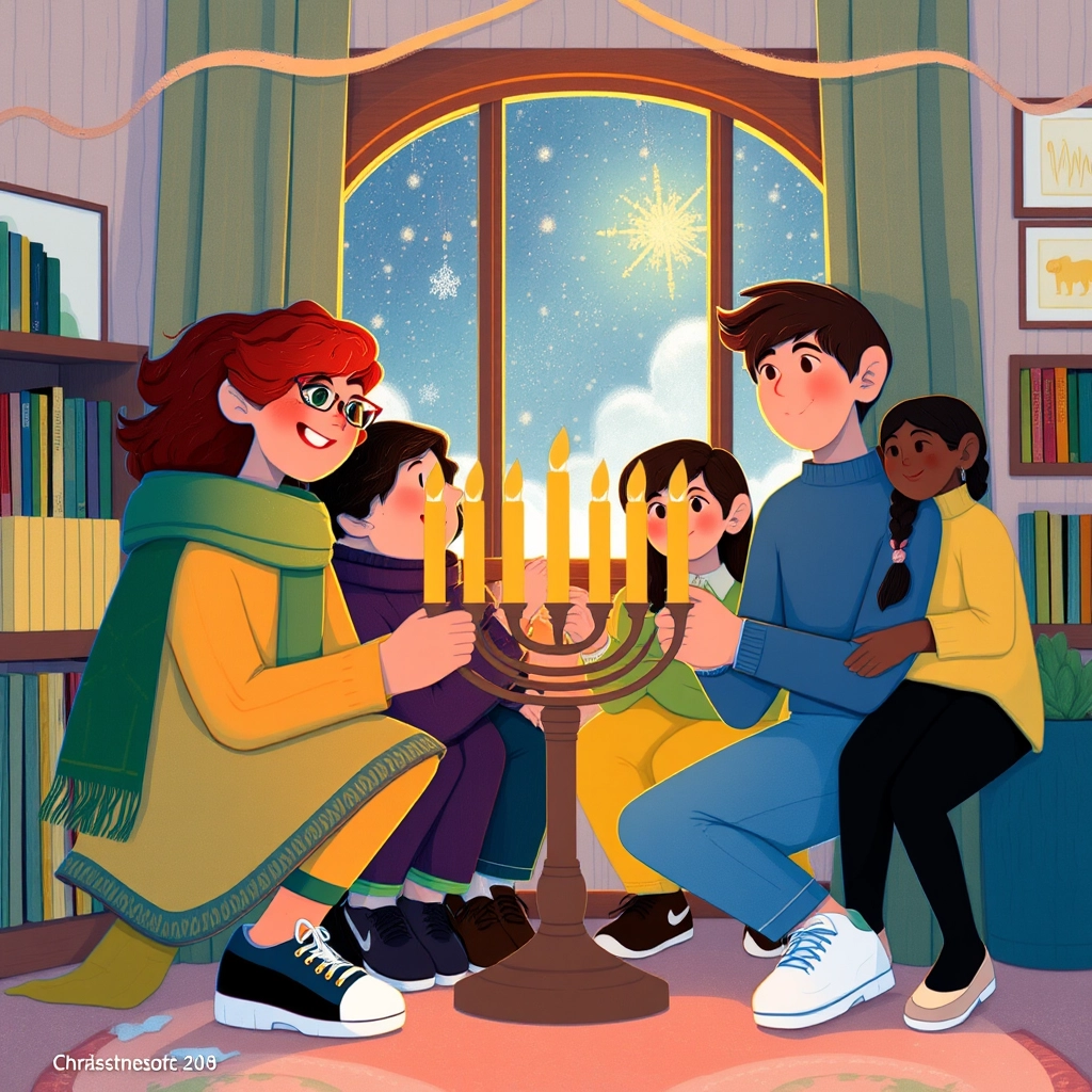 [Mia](R7QZVSJ3) looked around to see their friends [Aisha](K7BVBZW4), [Liam](ZNQYYQWF), and [Sophie](G43ZMWW5) already there. [Ben](F46YPTPX)’s parents explained the meaning of the menorah and how each night they light another candle to remember the miracle of the oil that lasted eight days in the ancient Temple.