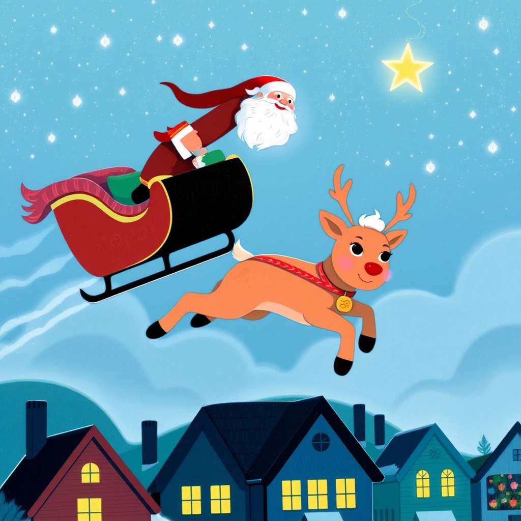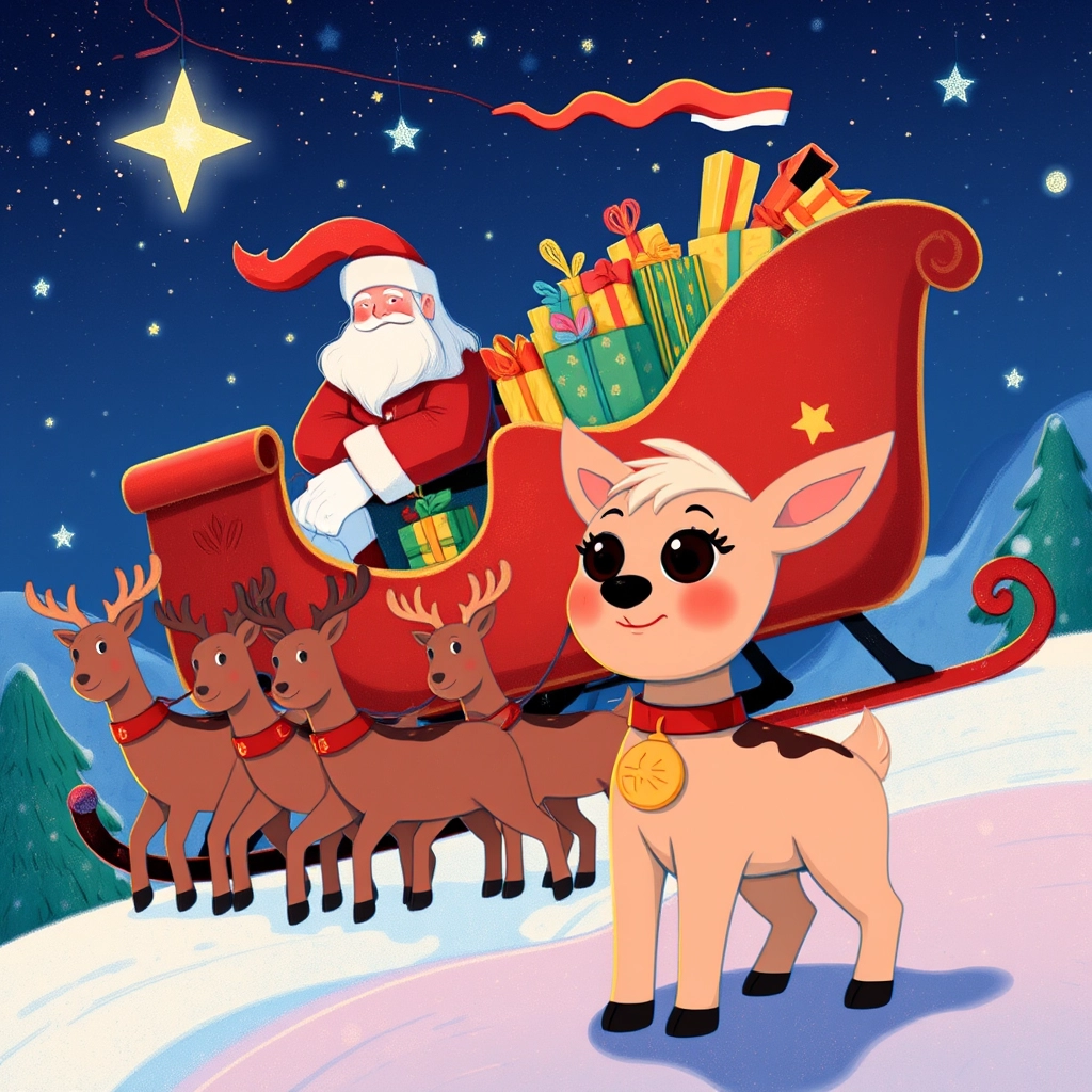 As the stars began to twinkle, Santa loaded his sleigh with presents piled so high they seemed to reach the moon! The reindeer lined up eagerly, with [Molly](D2RFHQKQ) hoping she would join this magical adventure.
