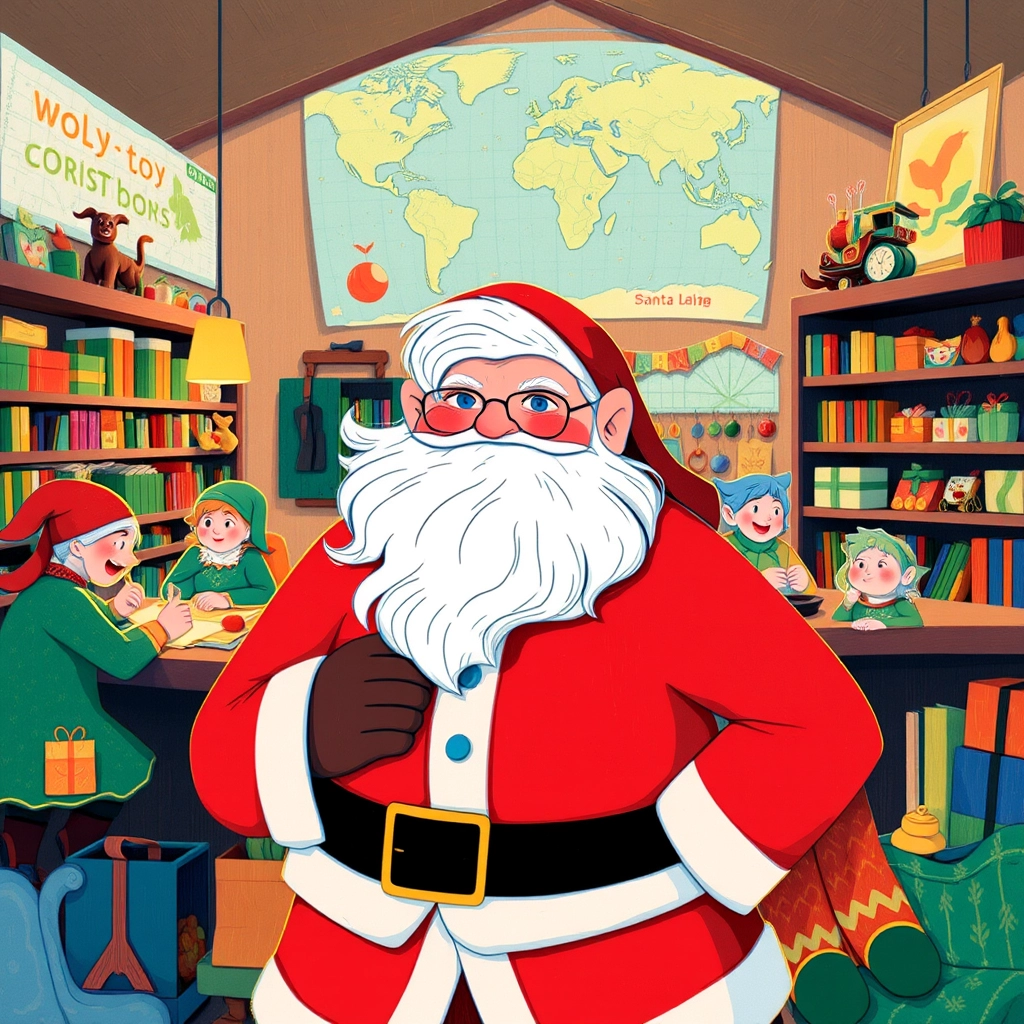 High above the village, in a cozy workshop filled with colorful toys and cheerful elves, [Santa Claus](5B4RXGTY) checked his list twice. 'We're almost ready, team!' he announced with his booming laugh.