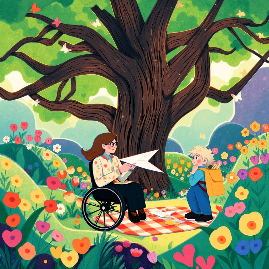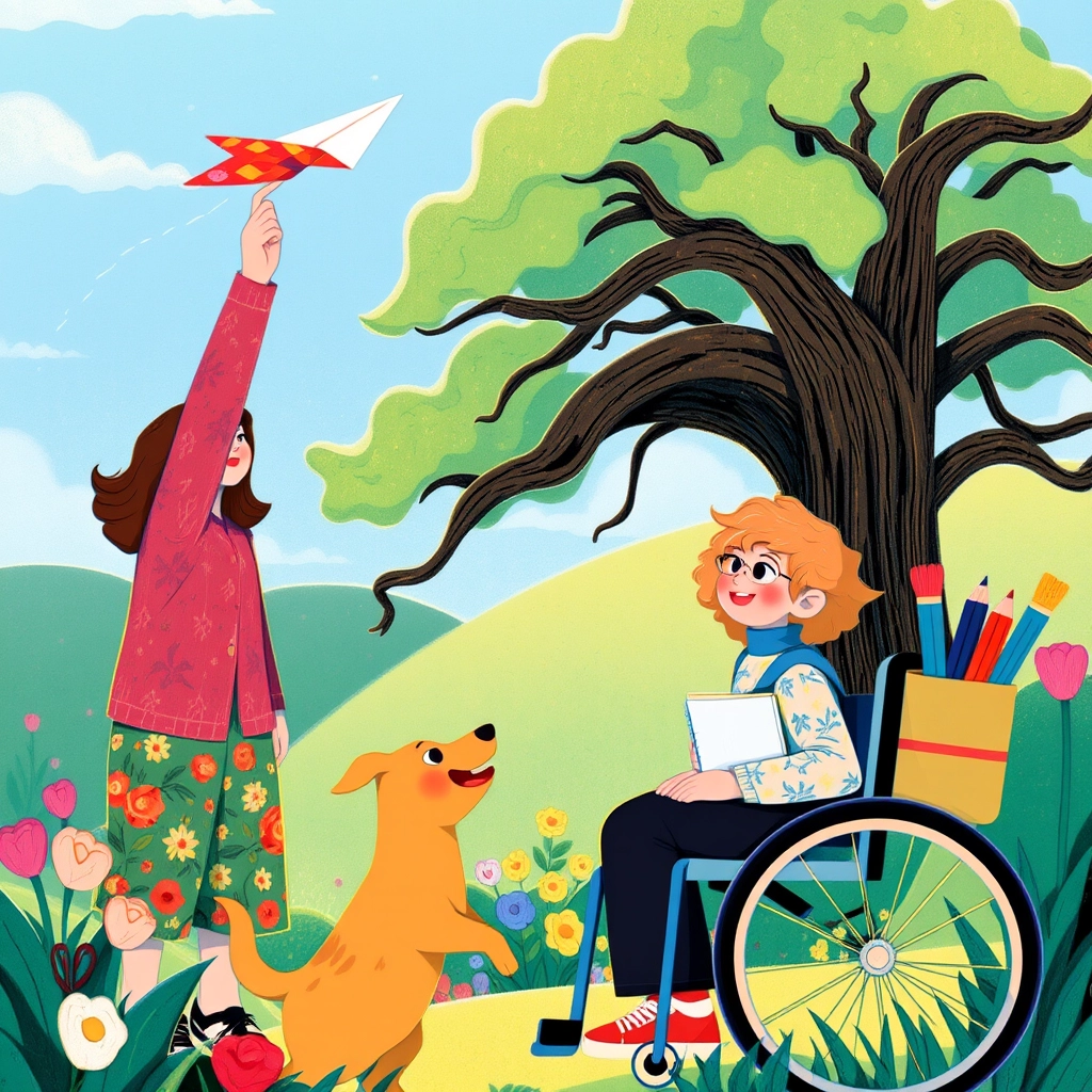 The journey began as they packed their favorite things: snacks, a notebook, and [Leo](VCBPG7FM)'s collection of paper airplanes. [Grace](YXSSY44G) led the way in her wheelchair, while [Leo](VCBPG7FM) picked wildflowers and handed them to her along the path.