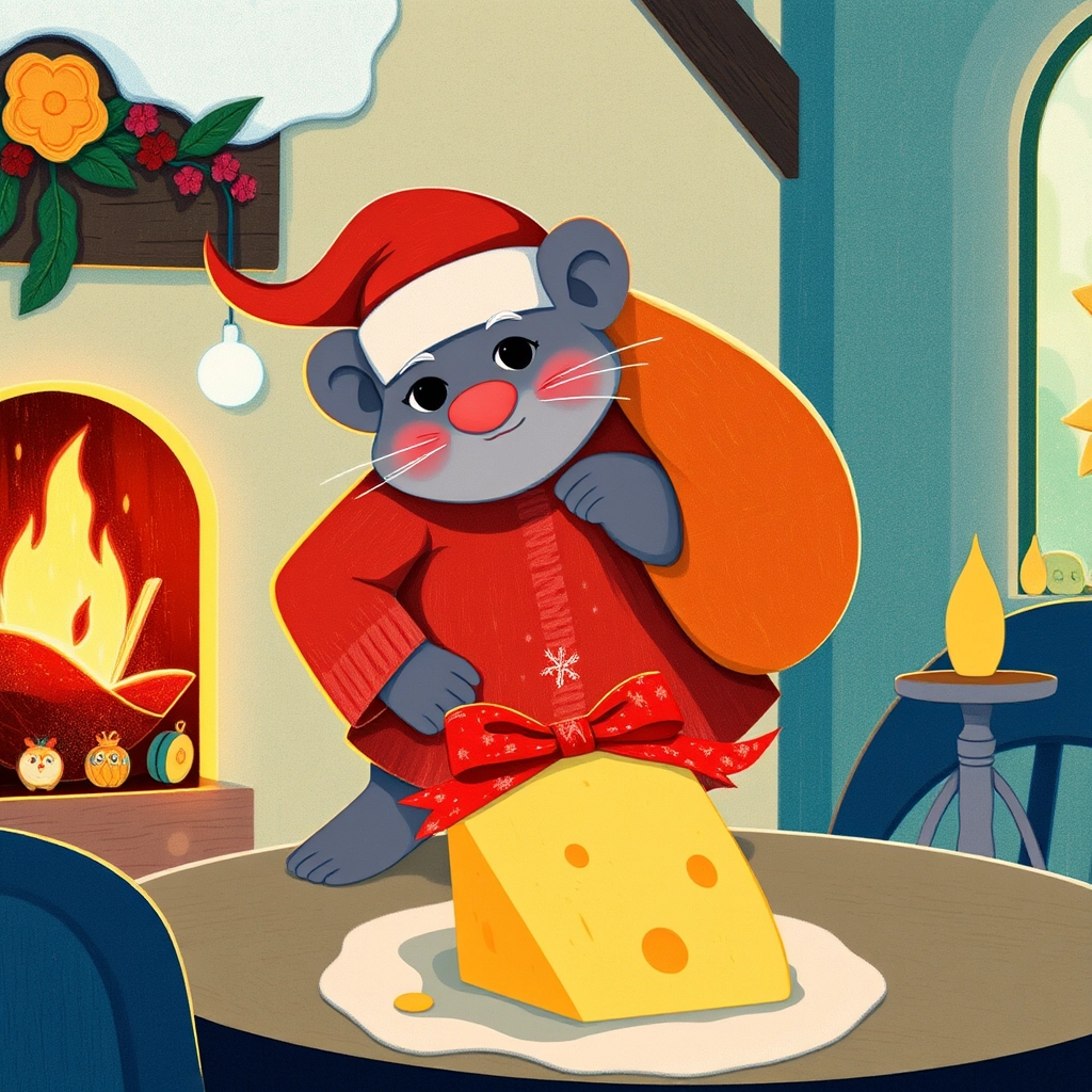 As midnight struck, a jingle of bells echoed! Down the cheese chimney came [Santa Mouse](MDCNS9WC) with a twinkle in his eye. He left two golden slices of cheese on the table, wrapped in festive red ribbons.
