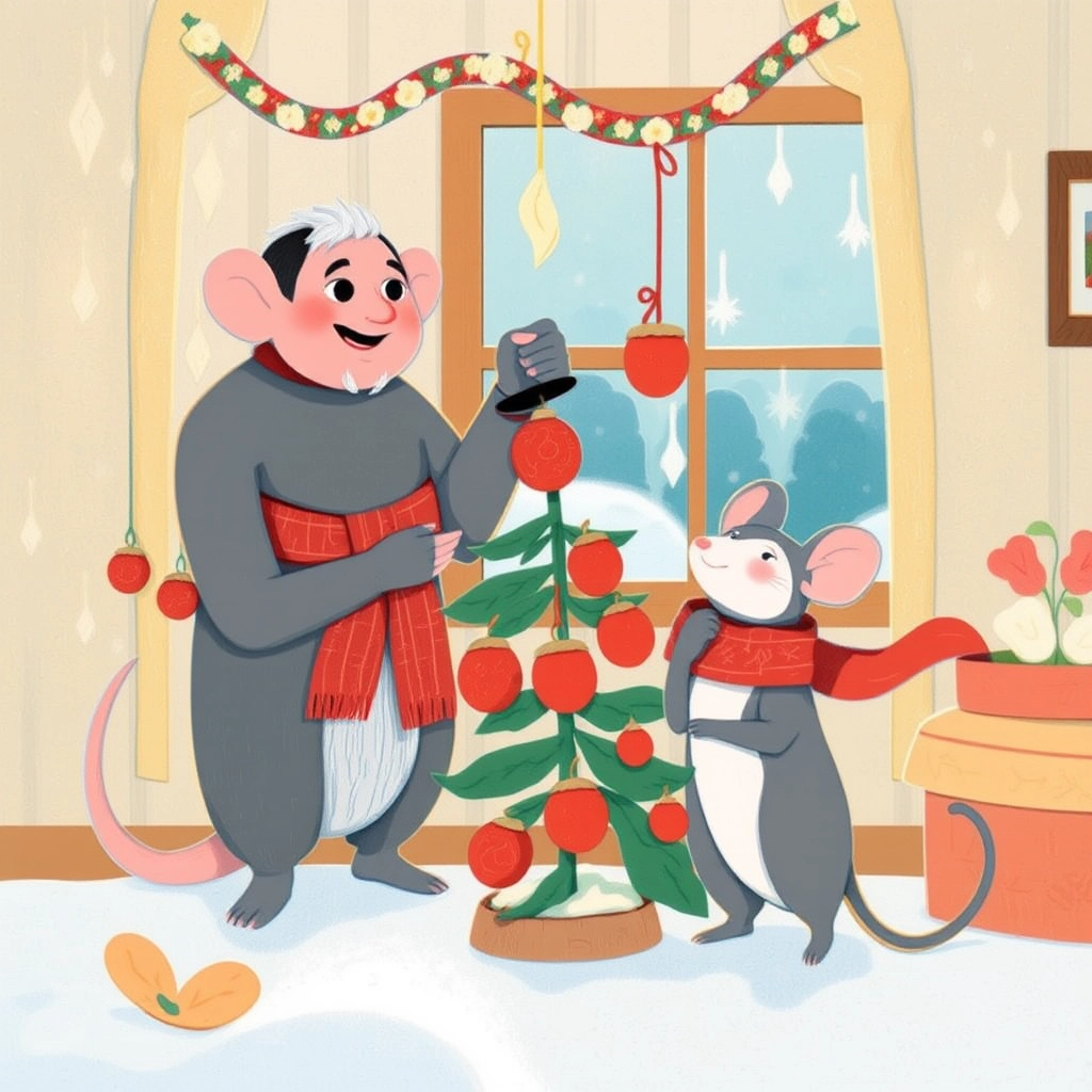 It was Christmas Eve. [Bernie](DJGWJD29) and [Bernadette](LNL4NWHZ) decorated their cheese house with popcorn garlands and acorn ornaments, while snowflakes danced outside their window. "I wish for something sweet this Christmas," [Bernadette](LNL4NWHZ) said.