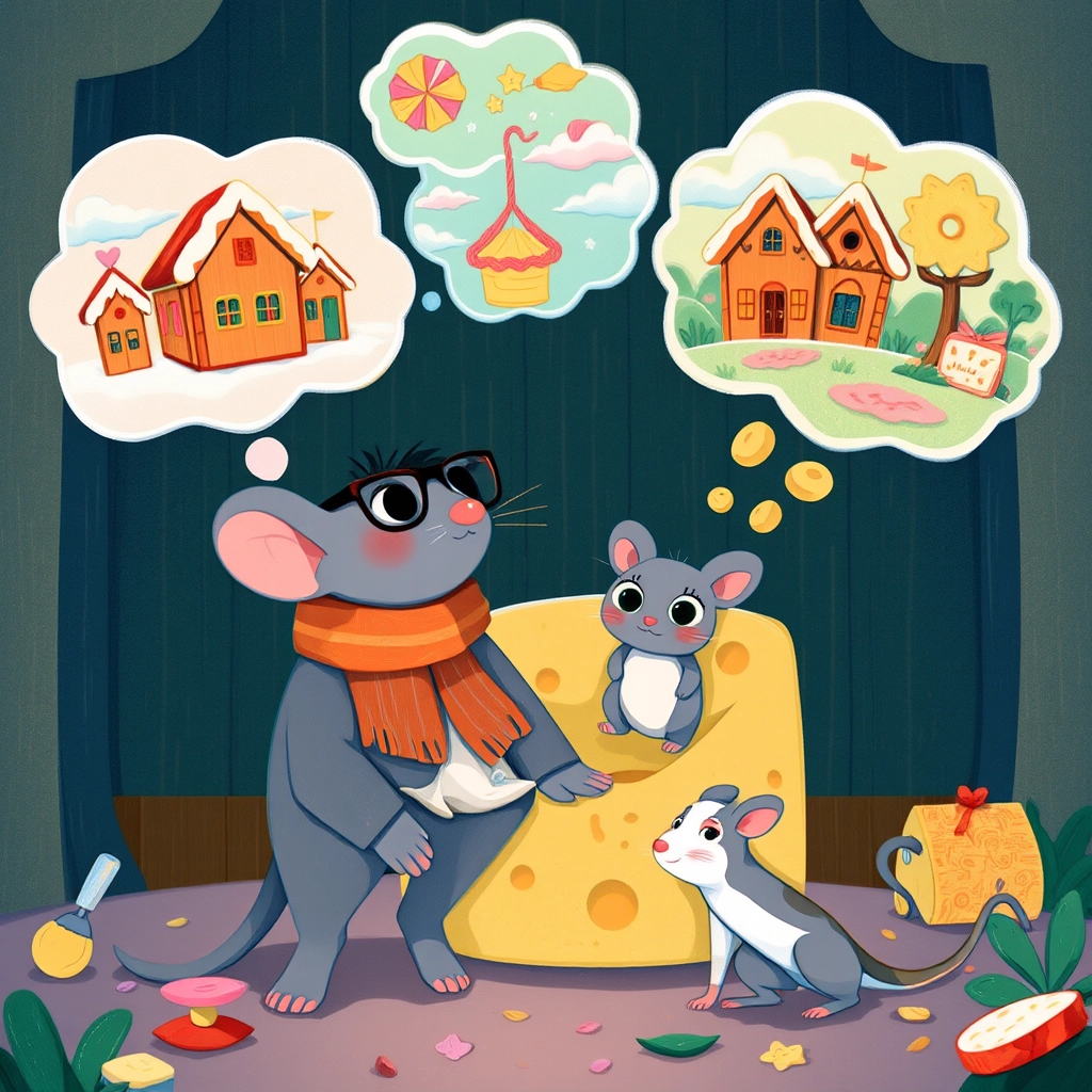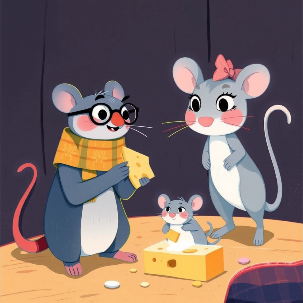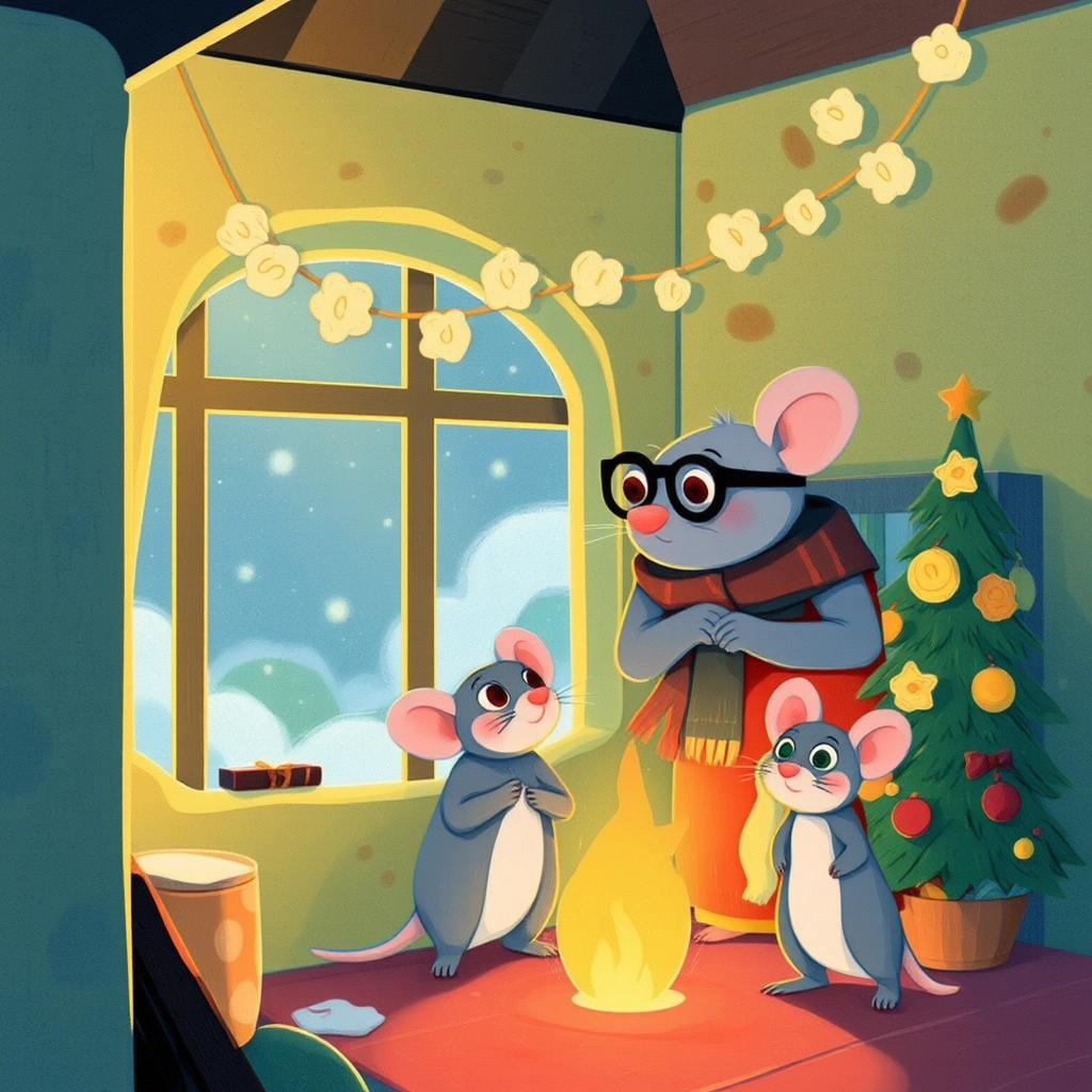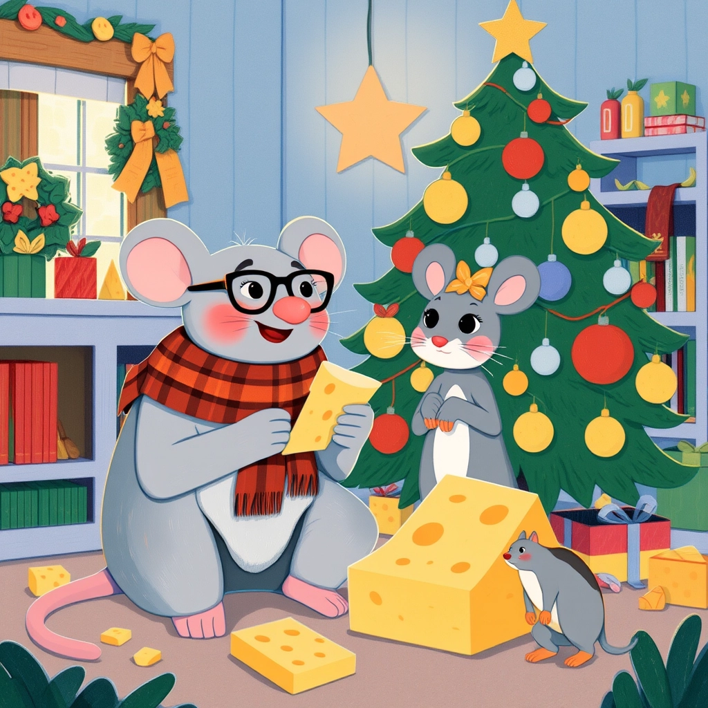 One snowy Christmas Eve, as they decorated their cheese house with popcorn garlands, [Bernadette](QHWGJGRP)'s whiskers twitched. 'Why do we have to live in a cheese house, Papa?' she asked.