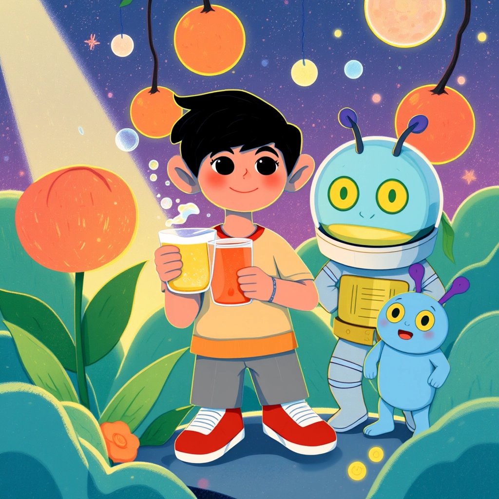 "Welcome to Mars," [Zog](K9CRPPM3) said. "Would you like to try some Martian juice? It's made from space berries!" [Aayansh](FDRRBK4B) took a sip, and it tasted like strawberries and magic.