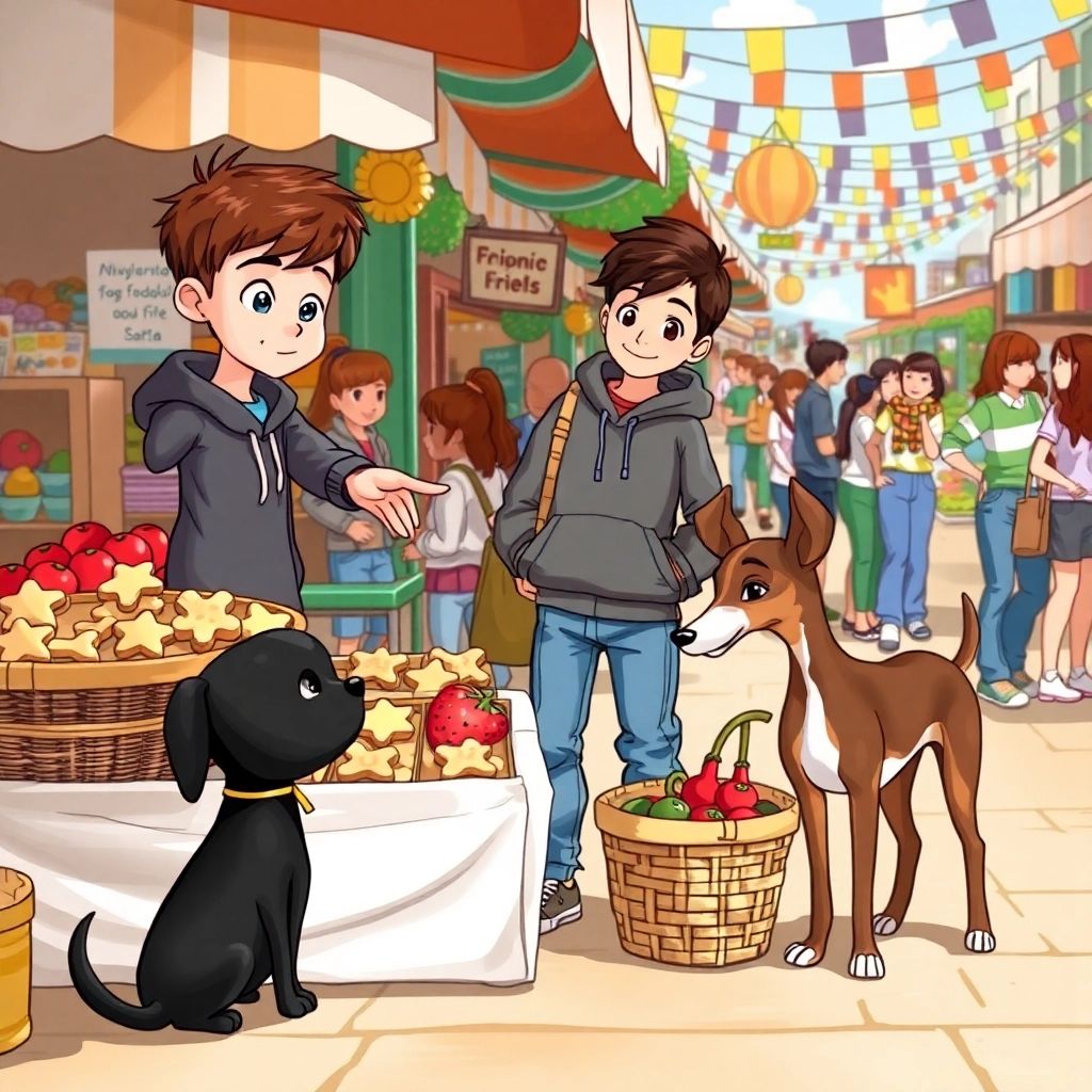 Zum Abschluss ihres Abenteuers liefen alle zusammen zu einem nahegelegenen kleinen Straßenmarkt. Es gab frisches Brot, Gemüse und Leckereien für die Hunde. 'Können wir das kaufen?', fragte [Frieda](9KKXXWCM) und zeigte auf einen kleinen Hundekeks-Stand.