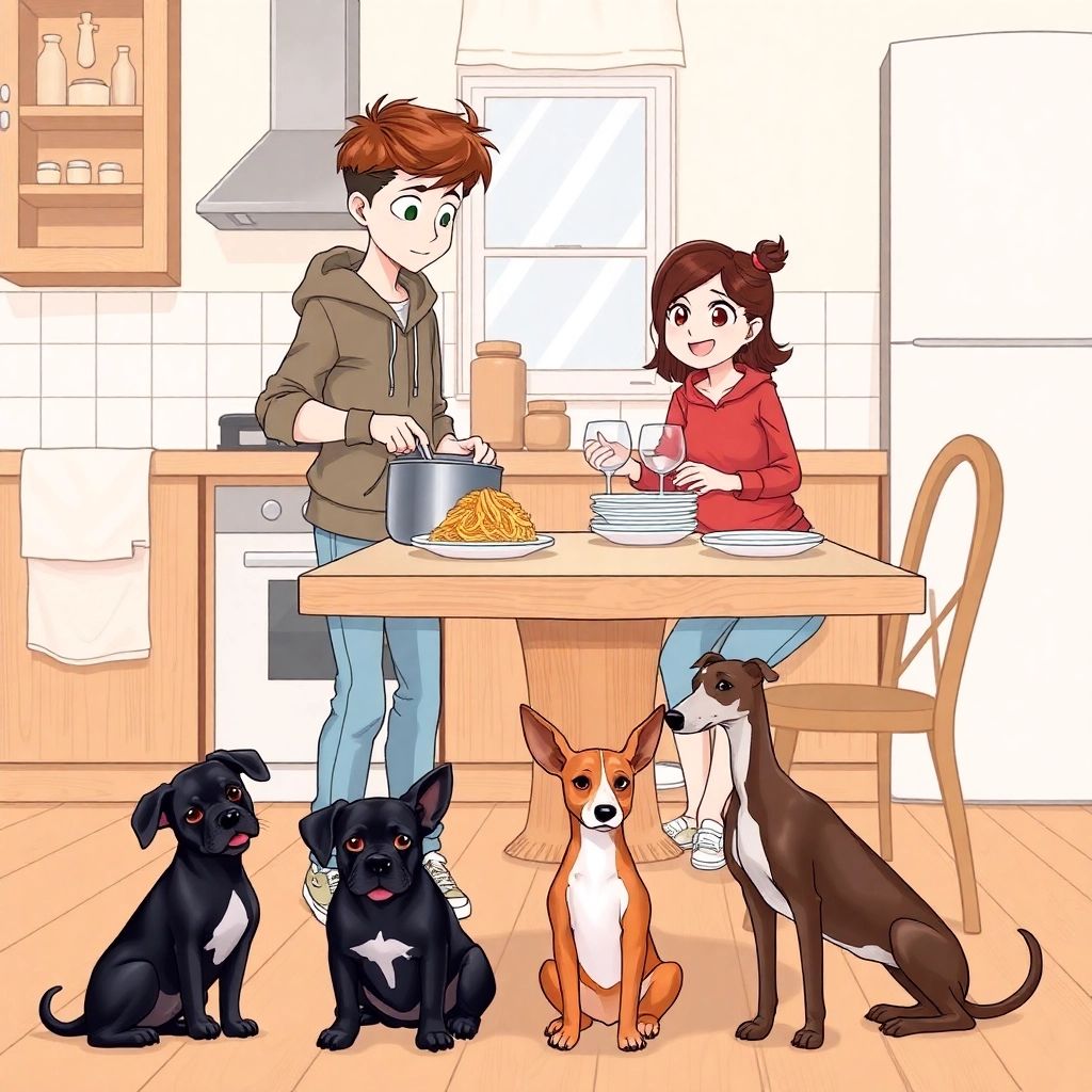 Am Abend kehrten sie glücklich und müde nach Hause zurück. [Carl](CRTNJPHM) kochte Spaghetti mit Tomatensauce, während [Frieda](9KKXXWCM) den Tisch deckte. Die Hunde lagen unter dem Tisch, schauten neugierig nach oben und warteten darauf, dass etwas herunterfiel.