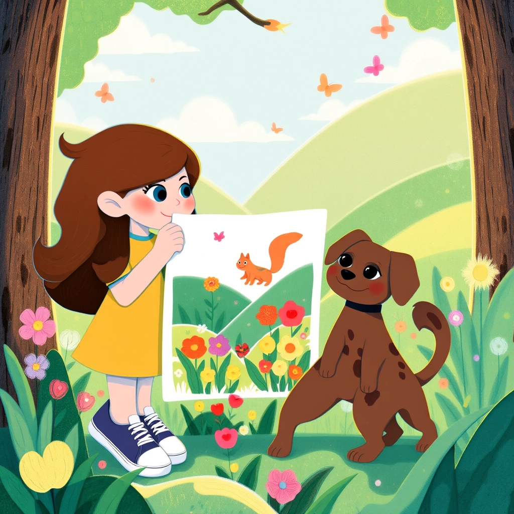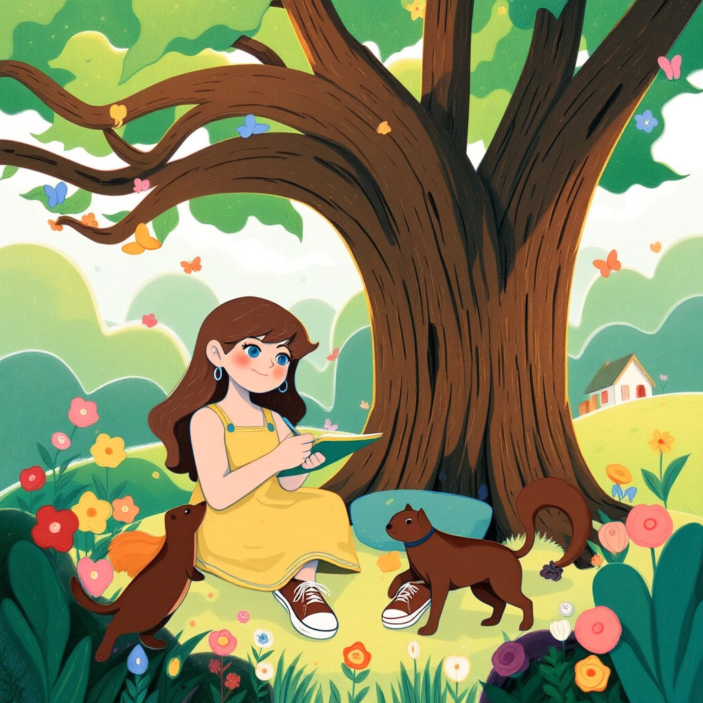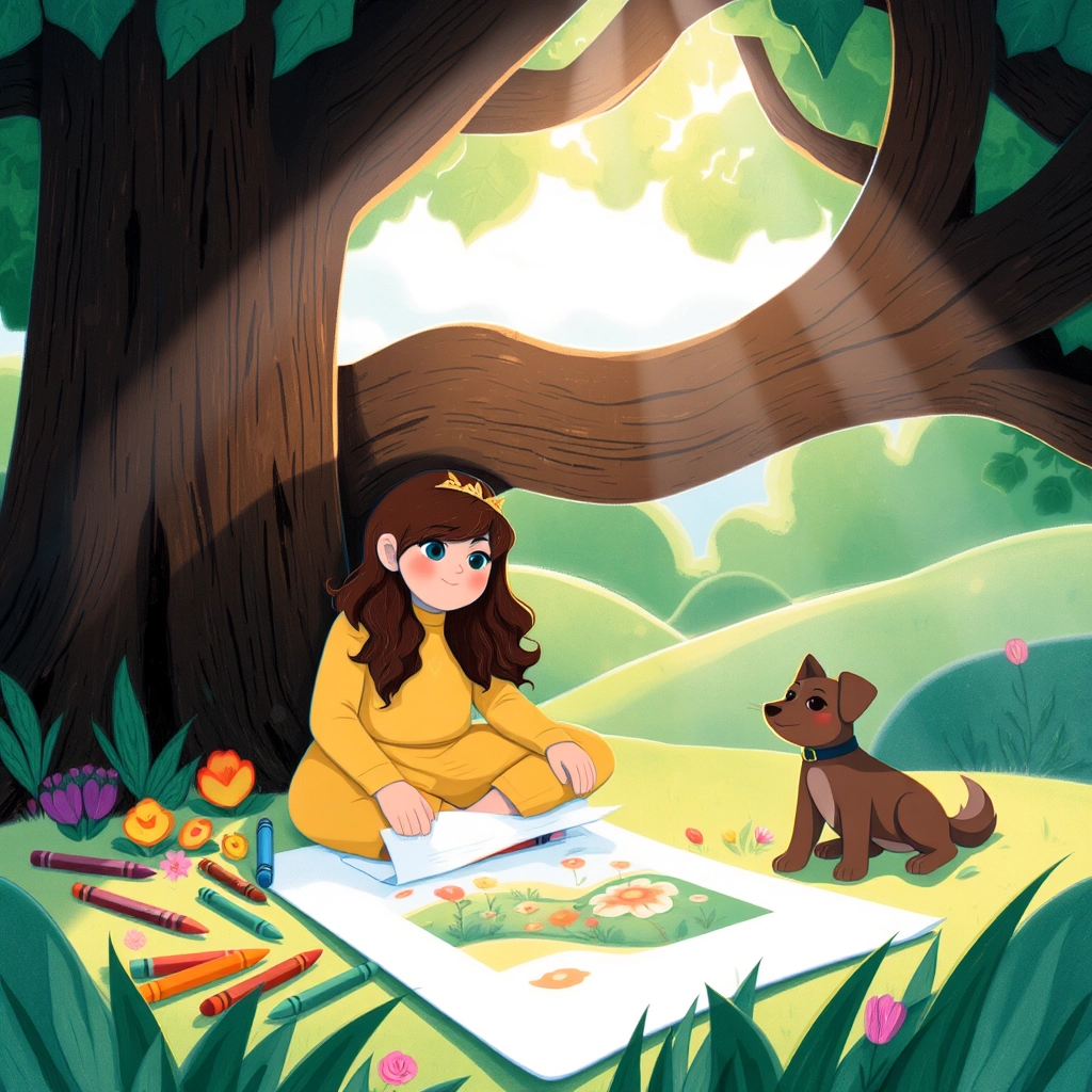 [Ada](7TP3VD39) found a cozy spot under a tall oak tree. She started drawing, creating a colorful meadowscape that captured all the beauty around her. [Chester](PJDLQN9B) watched, wagging his tail.