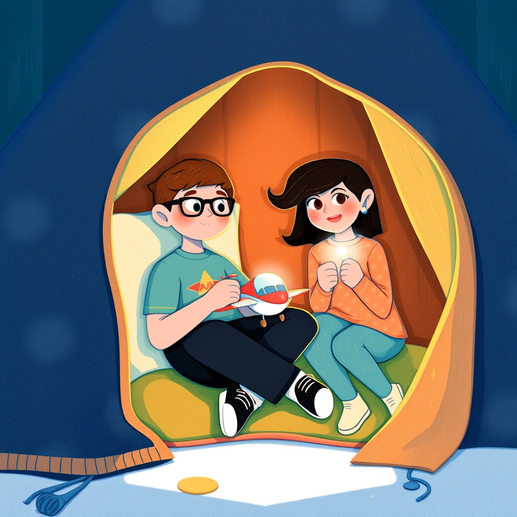 When their fort was complete, it looked amazing! It had a secret entrance and even a lookout window. Inside, they pretended to be pilots on an important mission. 'Captain [Adabjot](Q2QG3LGH), where are we flying today?' [Kudrat](CY2WX3LW) asked with a giggle.