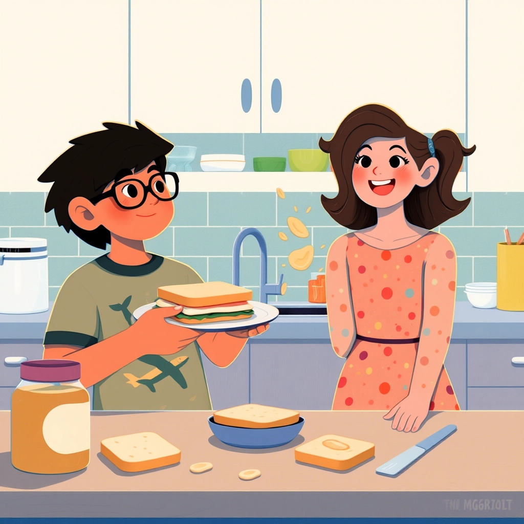They made peanut butter sandwiches together in the kitchen, with [Kudrat](CY2WX3LW) spreading peanut butter messily while [Adabjot](Q2QG3LGH) tried to clean up. They both laughed as peanut butter ended up on [Kudrat](CY2WX3LW)'s nose.