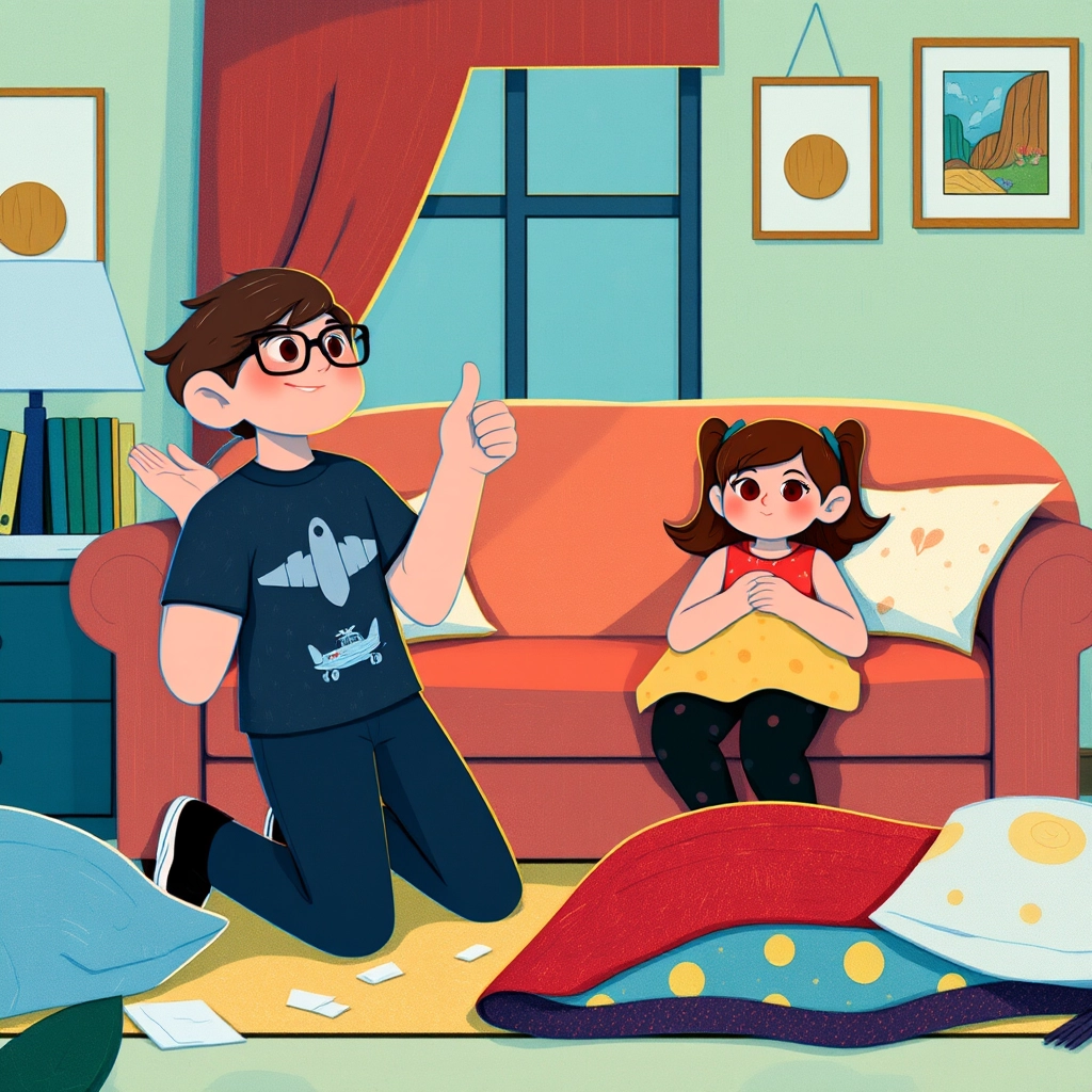 Together, they began building the ultimate fort using cushions from the sofa, blankets from the closet, and some cardboard boxes they found in the kitchen. 'This is going to be an airplane fort!' [Adabjot](Q2QG3LGH) declared, stacking the cushions carefully.