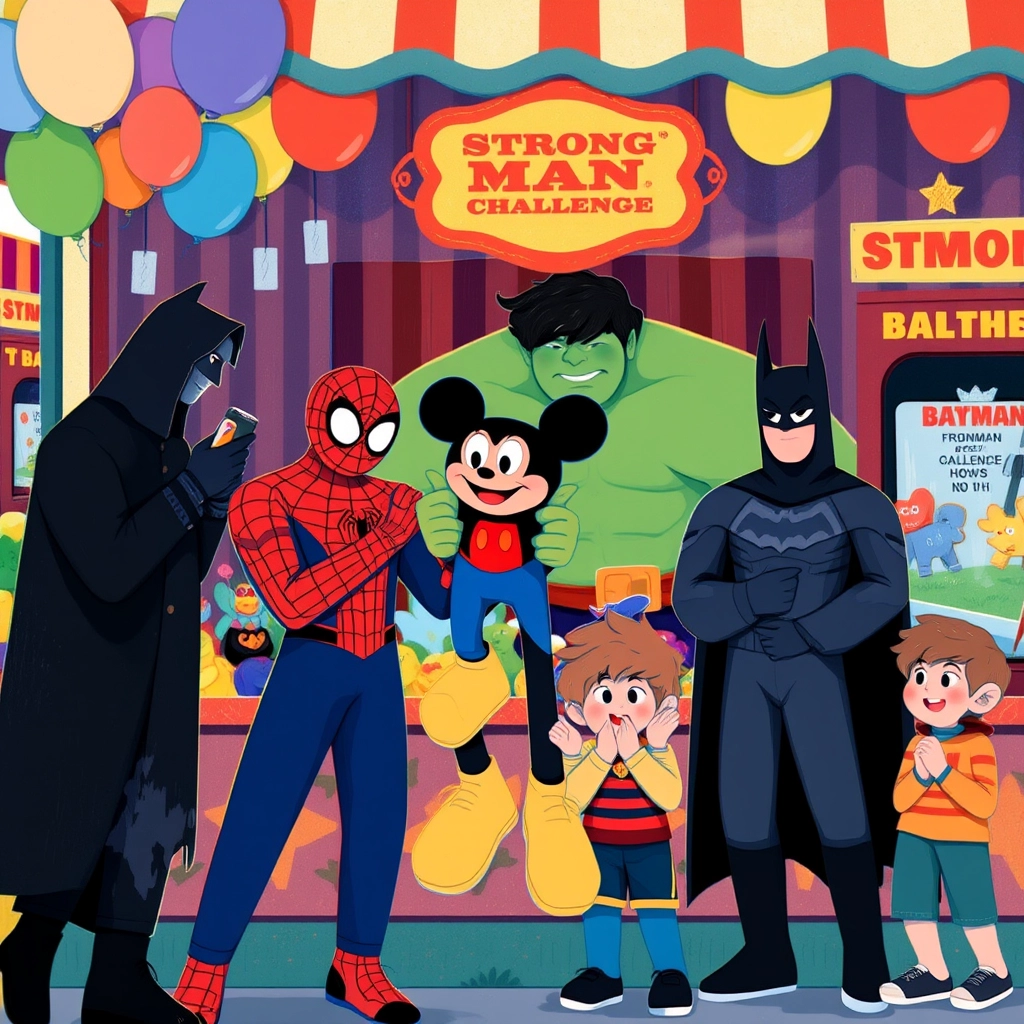[Hulk](V6GHLLNF) wanted to win [Jimmy](44Z4W996) a prize, so they headed to the carnival games. Everyone cheered as [Hulk](V6GHLLNF) used his strength to win a big stuffed Mickey toy!