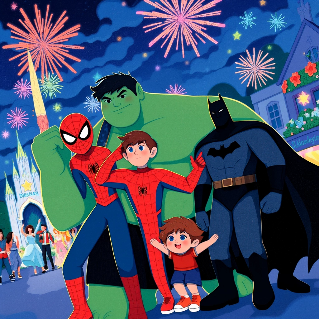 [Jimmy](44Z4W996) was a 5-year-old boy with boundless energy. Today was special because he was going to Disneyland with none other than [Spiderman](ZMRHL7M2), [Batman](YZPJ77DH), and [Hulk](V6GHLLNF)!
