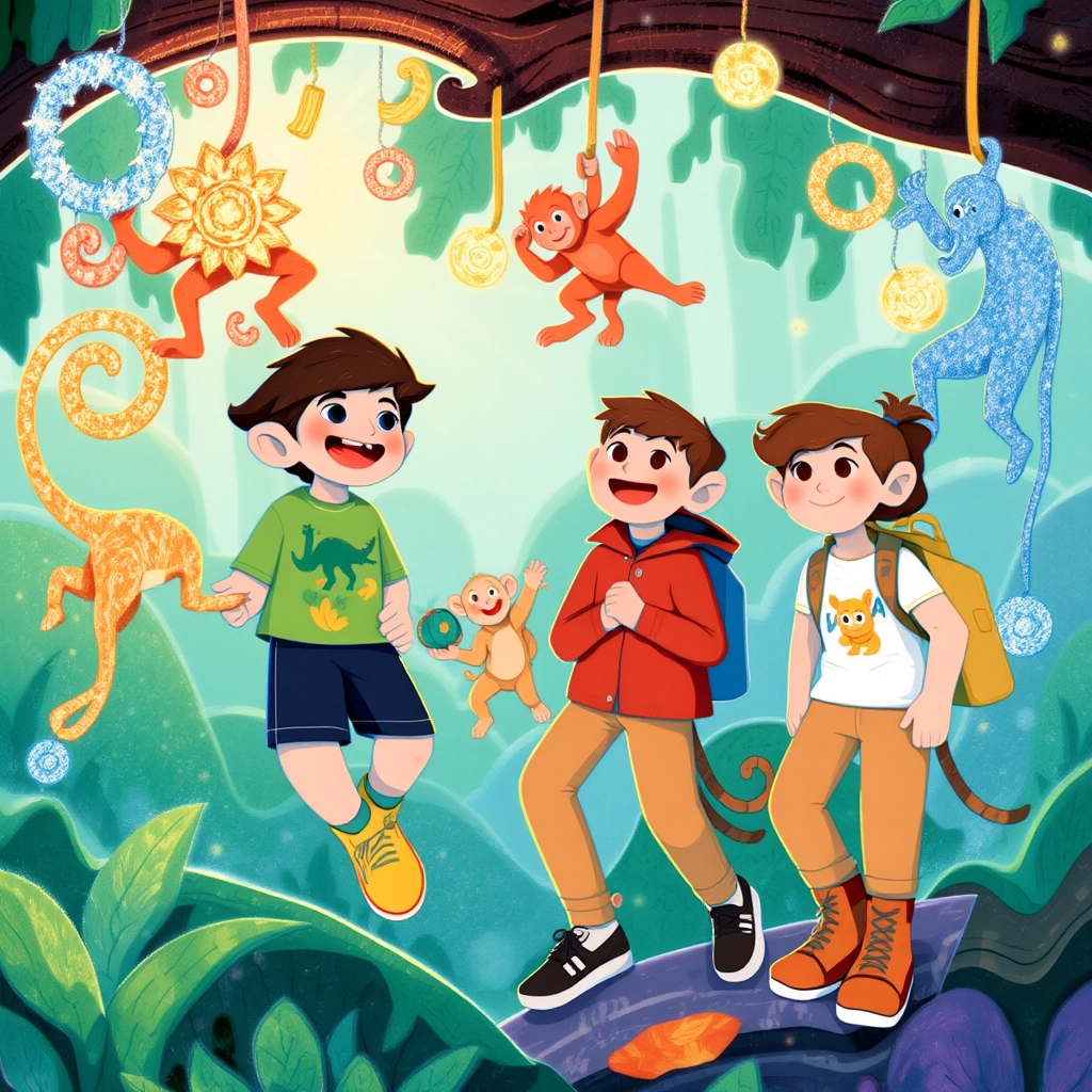 First, they visited the Land of Giggles, where cheeky monkeys swung from glittering vines, playing tag and laughing mischievously.