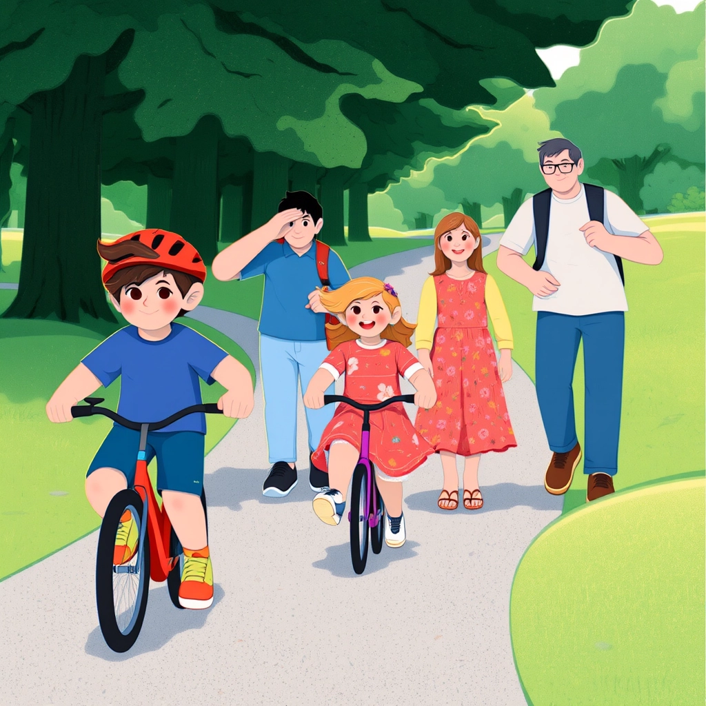One beautiful afternoon, [Logan](3JGBKJDS), who was 5 years old, and [Chloe](925Y3Q9H), who was 3, rode their bikes to the park with their [Mom](ZJKQD2QH) and [Dad](H4VV3M5X). The sun was shining, and excitement filled the air!