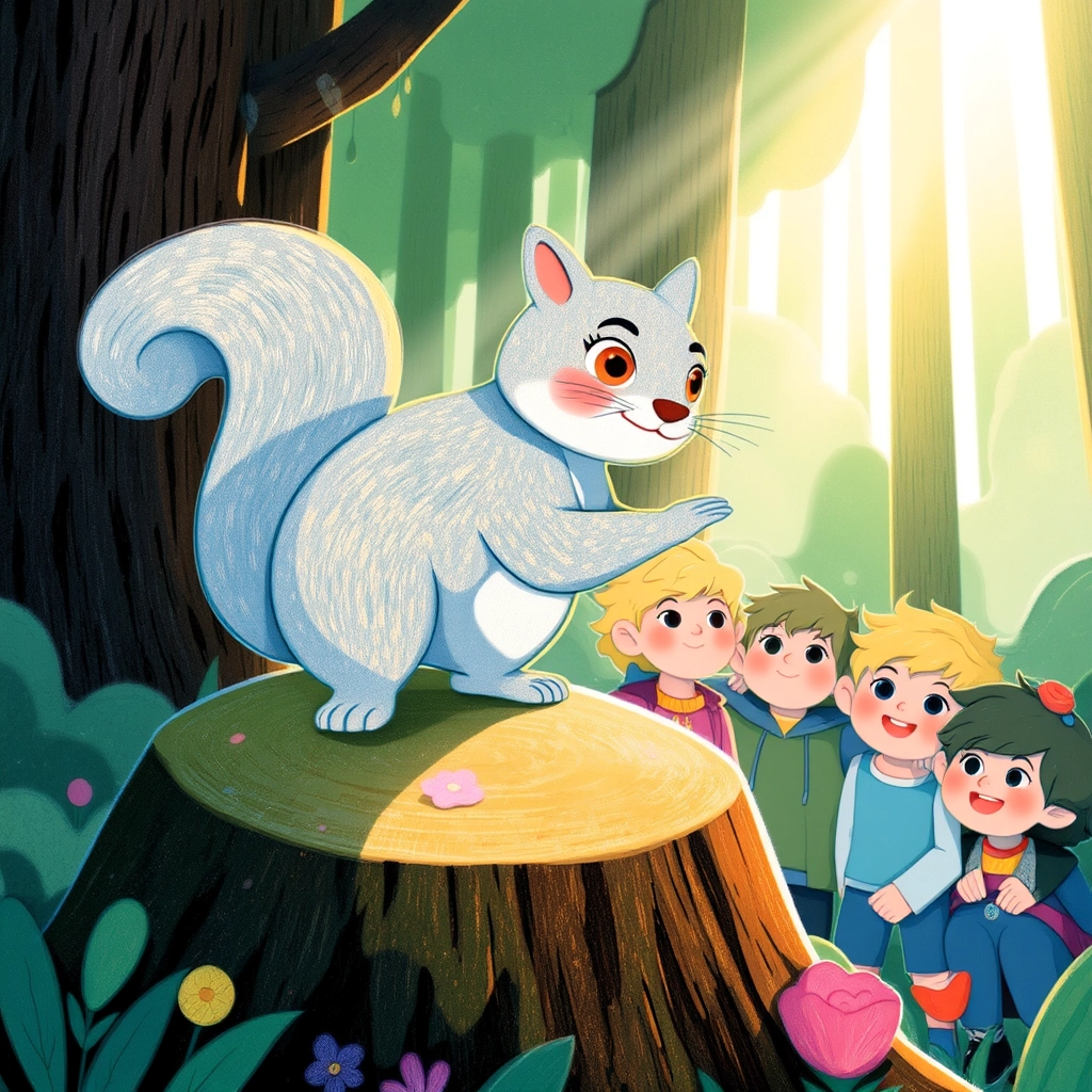 As they ventured into the forest, a peculiar sound caught their attention. The children turned to find a squirrel with shimmering fur and golden eyes waving at them!