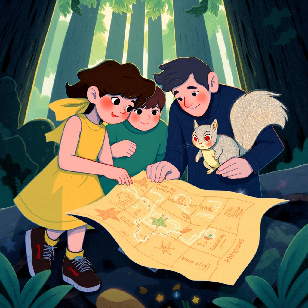 The family decided to help [Glitter](H4GYDZJ2), and soon they were following a map drawn with glowing ink. The map hinted at three clues hidden within the forest.
