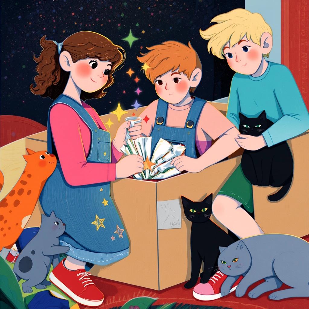 ‘Let’s build a spaceship!’ exclaimed [Liam](YWMXJC5J), holding up a shiny roll of aluminum foil. With the cats watching intently, [Mia](3HB4XHMK) found paints and brushes to decorate their vessel.