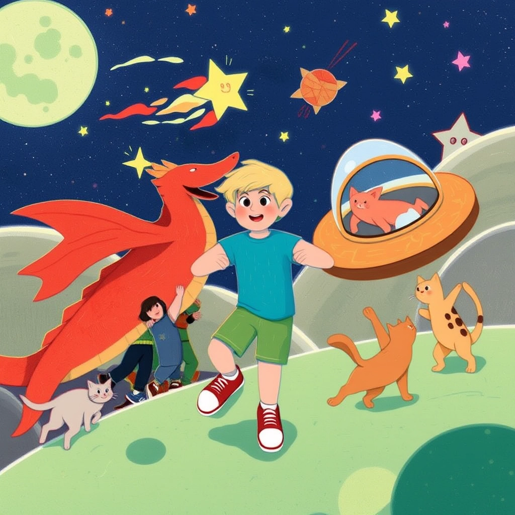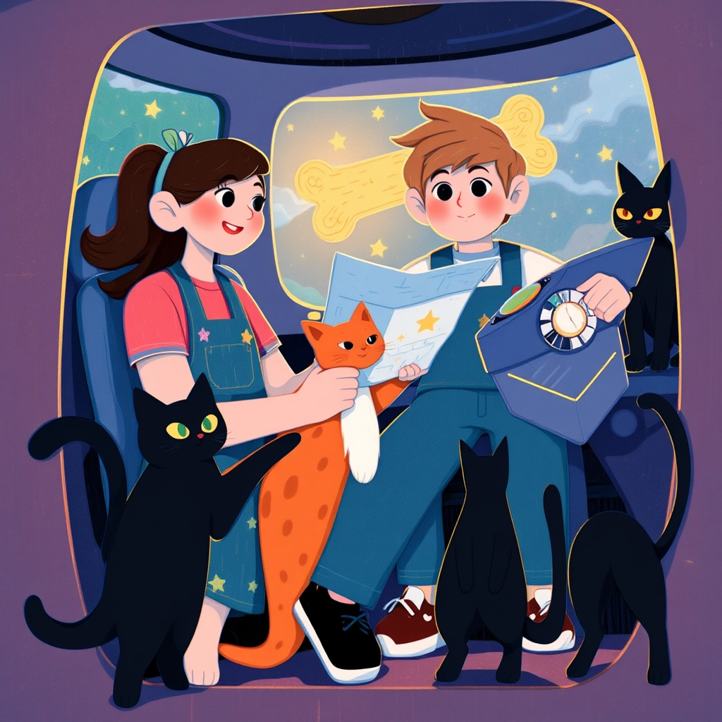 They imagined soaring past fields of stars and colorful planets. [Luna](TPKZ2K35), the gray fluffy cat, suddenly 'spotted' something strange—a shiny, golden bone floating in space!