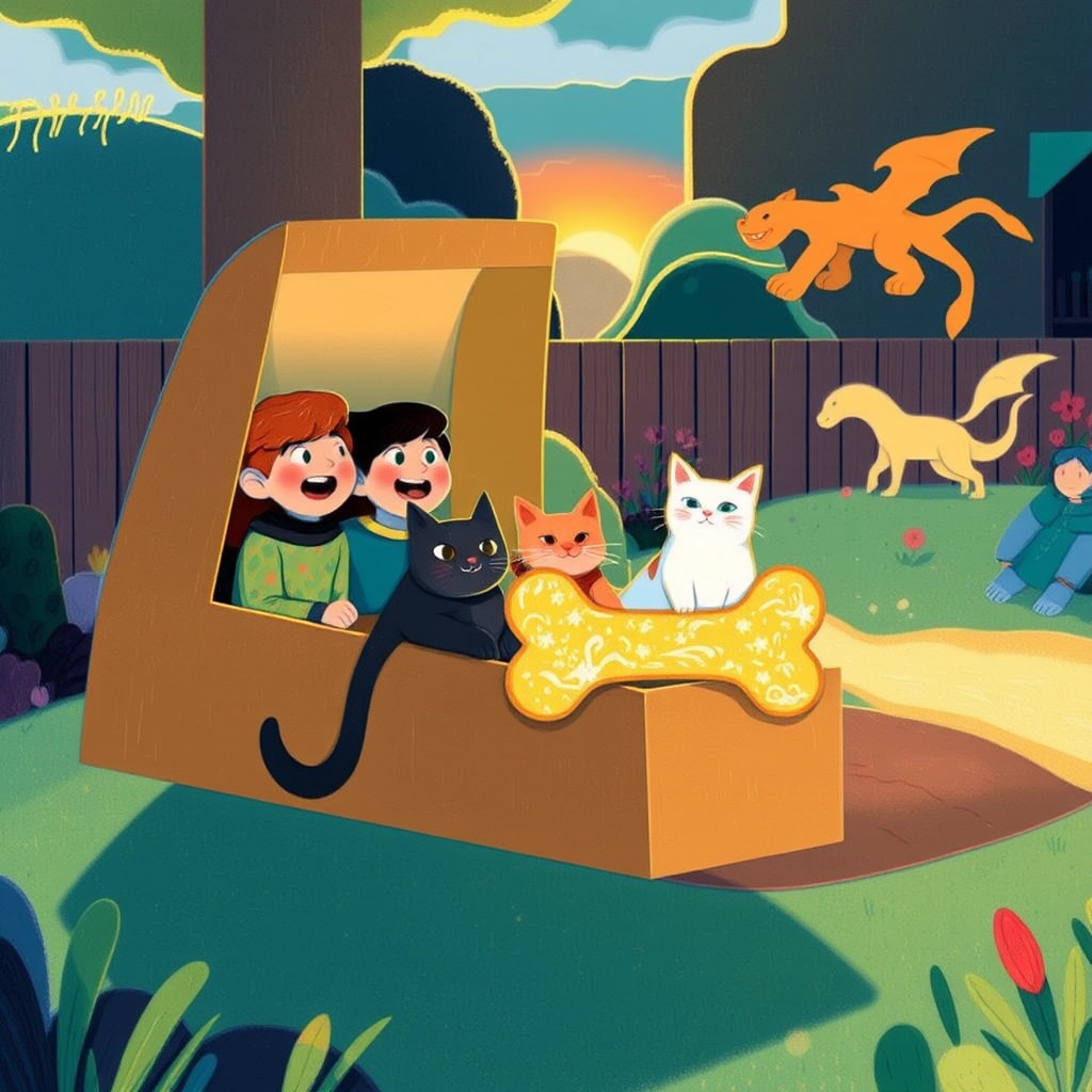 That night, [Mia](3HB4XHMK) and [Liam](YWMXJC5J) tucked the Golden Bone into a treasure chest and went to sleep, dreaming of more adventures with their three clever cats.