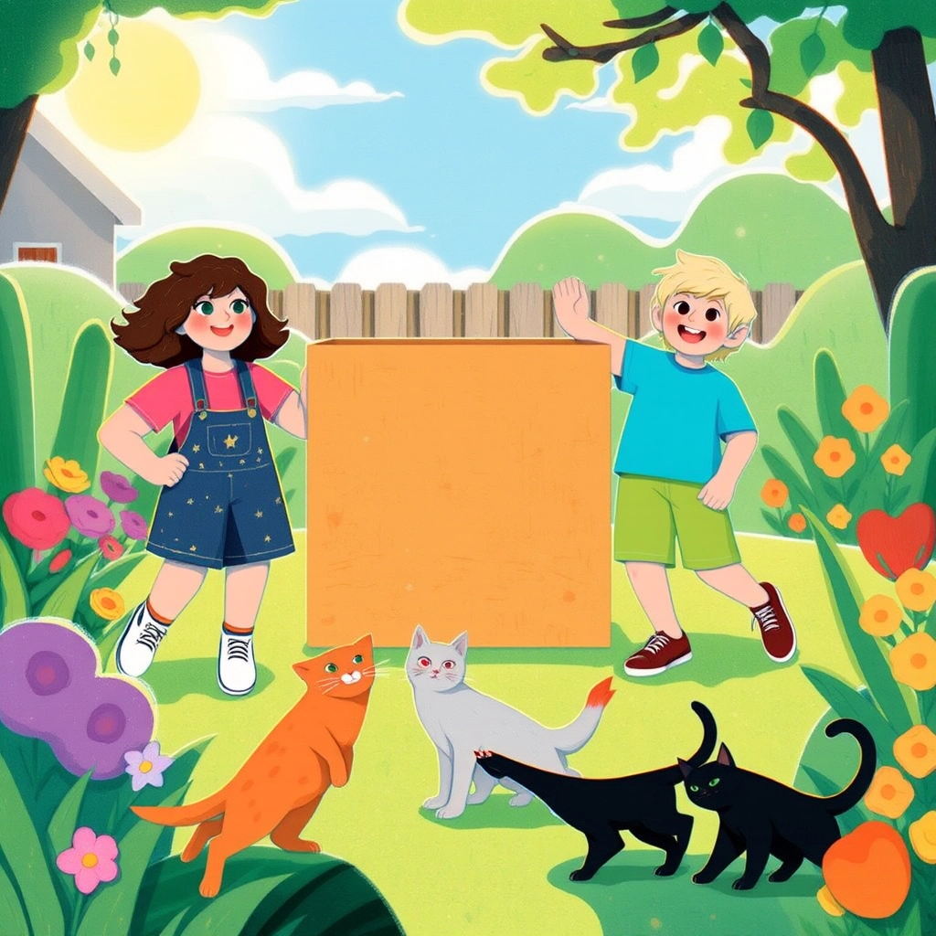 One warm, sunlit morning, [Mia](3HB4XHMK) and [Liam](YWMXJC5J) decided to turn their backyard into a magical land of exploration. With the help of their three curious cats, [Max](67MNTD7J), [Luna](TPKZ2K35), and [Shadow](7RRWB9LB), the adventure was about to begin!