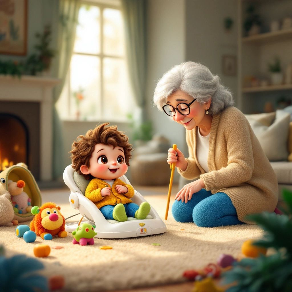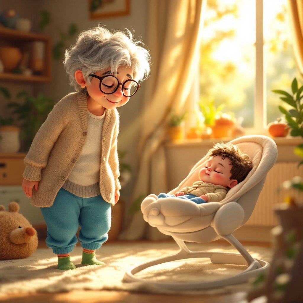 With his belly full and his mind filled with stories, music, and love, [Beau](6656TK5W) felt sleepy. [Grandma](BWLFPKNW) gently rocked him in his bouncer, humming a lullaby.