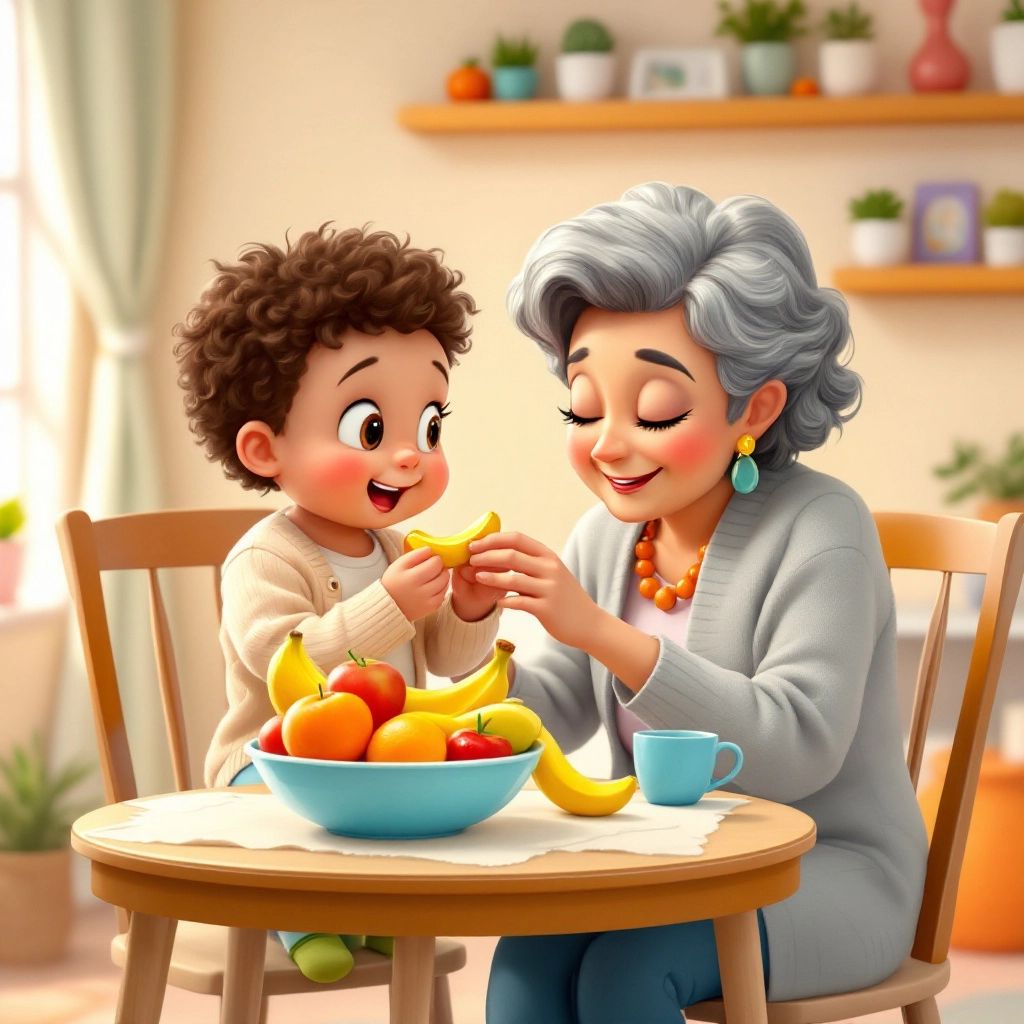 After all the excitement, it was time for a snack. [Grandma](BWLFPKNW) brought a fruit bowl and a soft banana just for [Beau](6656TK5W). Yum!