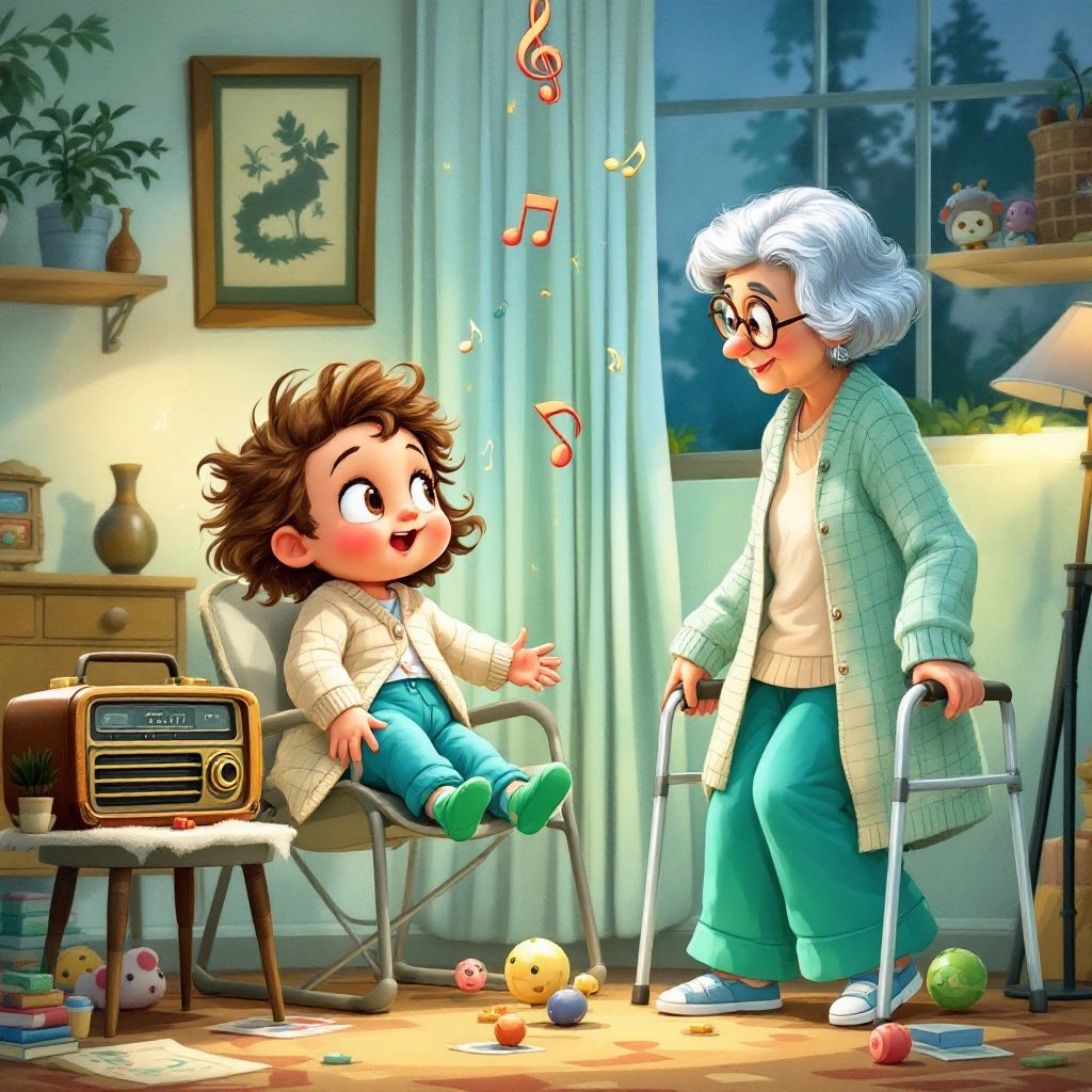 After the story, [Grandma](BWLFPKNW) decided it was time for some music. She turned on her old radio, and a cheerful tune filled the room. [Beau](6656TK5W)'s feet kicked with excitement, tapping along to the beat.