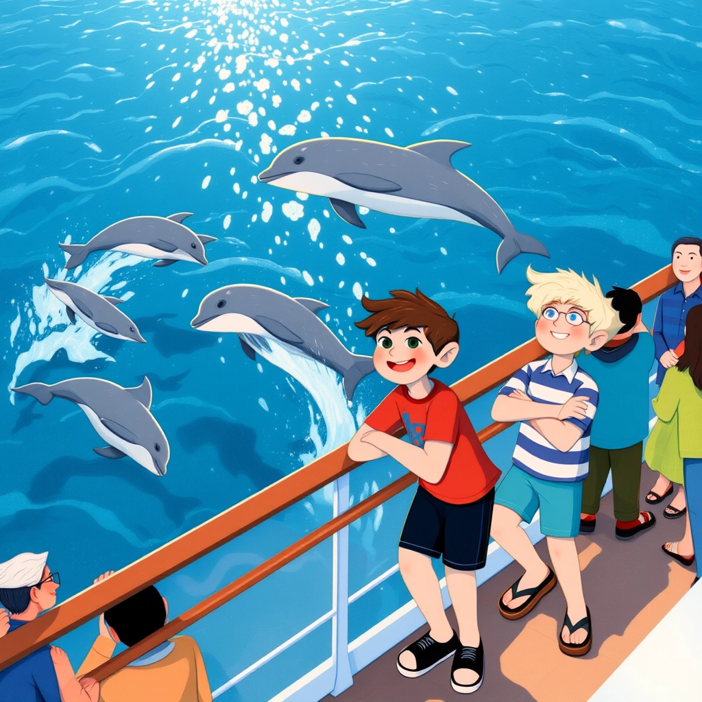 As the cruise ship began to move, [Oliver](YBPSBPD4) said, '[Benjamin](ZPKN34BY), look at the dolphins!' A few dolphins jumped gracefully alongside the ship, causing everyone on the deck to cheer.