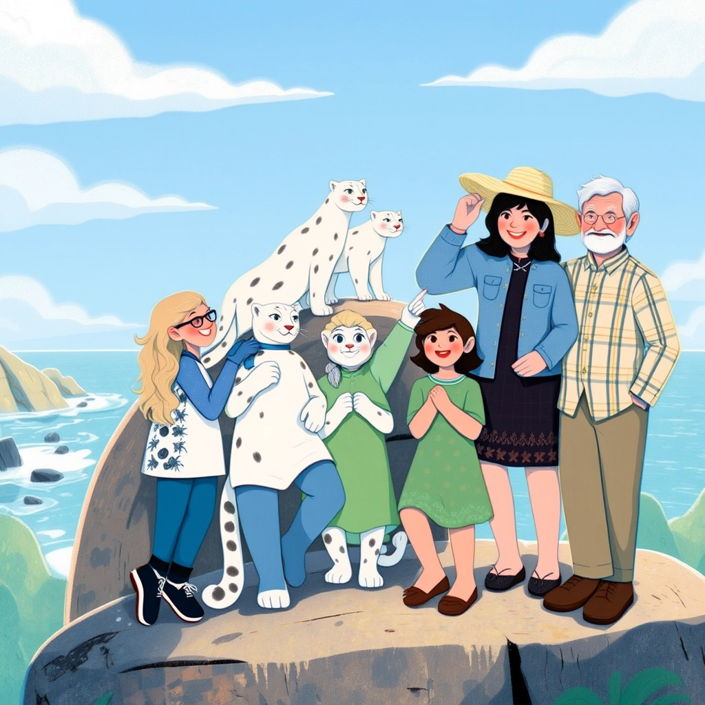 [Grammy](G2RY3GGV) and [Gramps](4P6ZNGVX) joined them on the beach. “Look at that!” [Grammy](G2RY3GGV) exclaimed, pointing to a family of snow leopards watching over the scene from a nearby rocky hill.