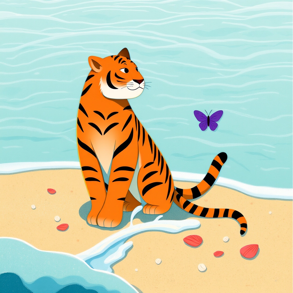As the group explored the shoreline, they found a tiger with golden-orange fur sitting serenely by the waves, its tail swishing through the sand.