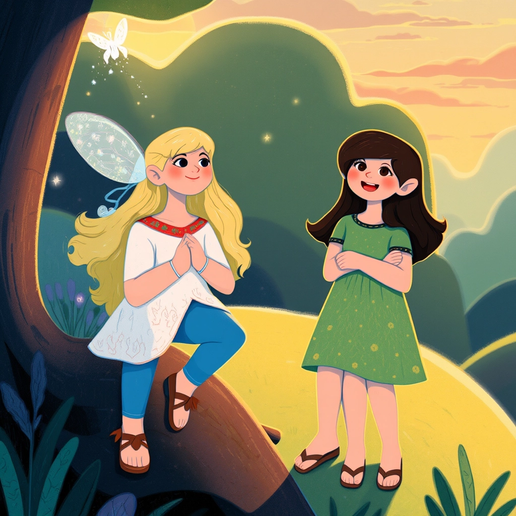 “What a magical day!” [Caitie](T6JBR49W) whispered as she saw a fairy land gently on [Mika](ZNYCJT7H)’s shoulder, leaving a trail of shimmering golden dust.