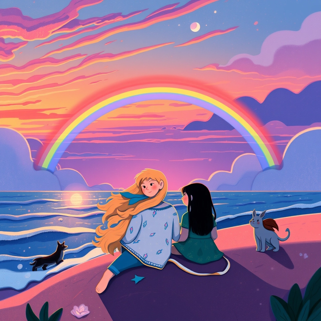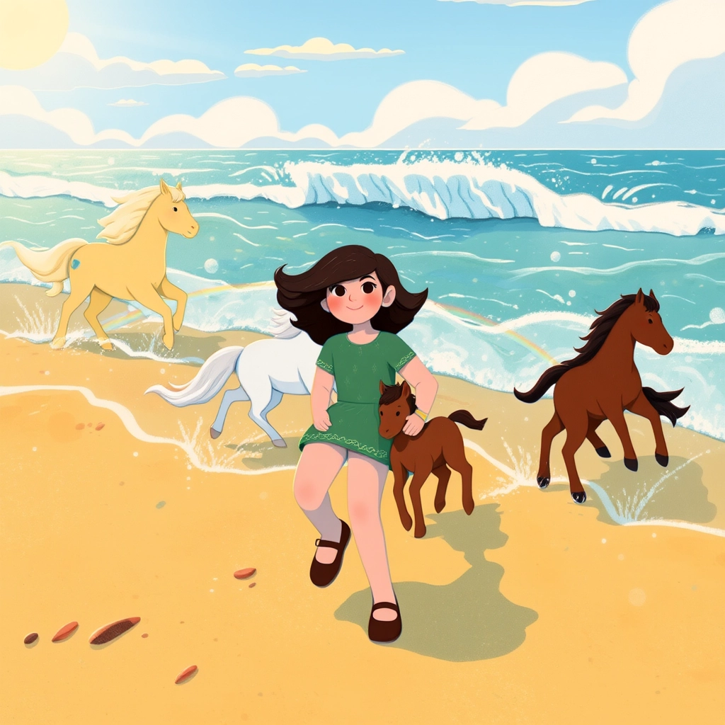As the girls ran down to meet the horses, a shimmering rainbow appeared, connecting the sky to the ocean. Tiny fairies fluttered around, giggling and waving to them.