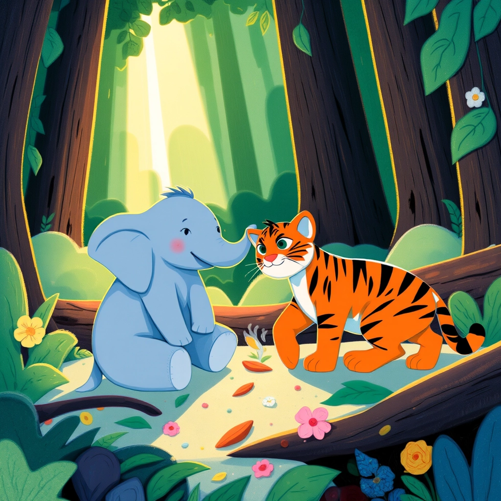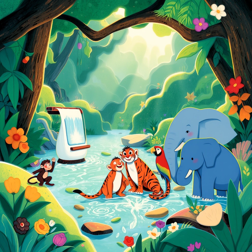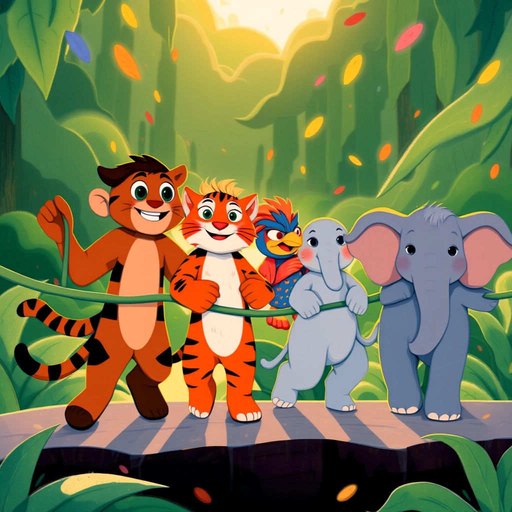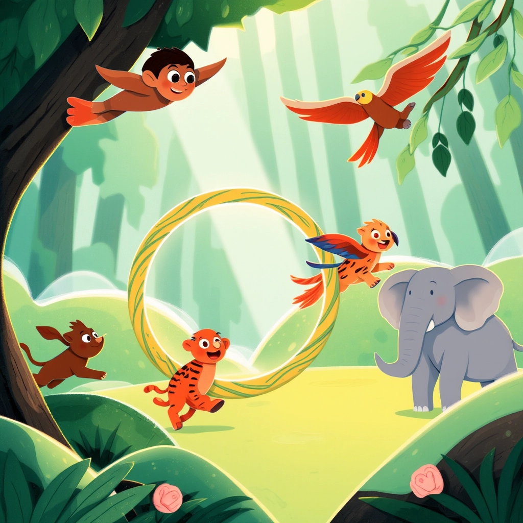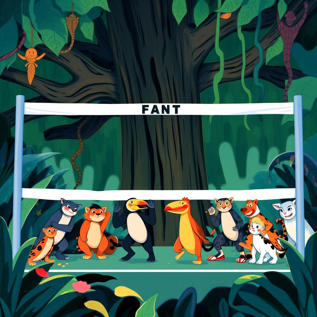 Deep in the heart of Jungle Land, a lively group of animal friends gathered by the glistening river. Today was no ordinary day—it was the day of the Great Jungle Race!