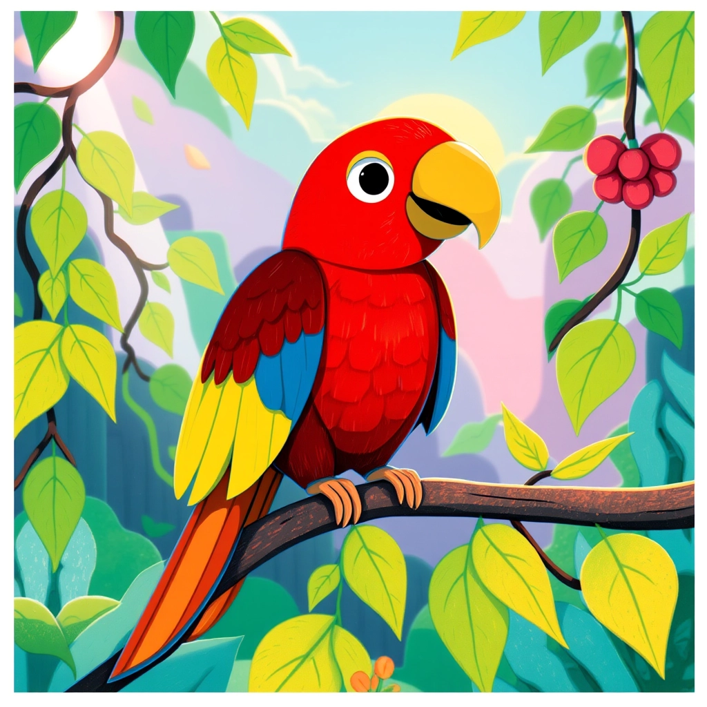 [Polly](YVCZJNHJ) the parrot perched on a tree branch, her feathers a radiant mix of red, blue, and yellow. ‘Flying is my superpower!’ she chirped.