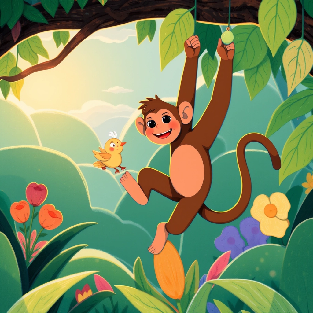 [Milo](6GSCCMPJ) the monkey, with his agile tail and mischievous grin, swung from vine to vine, ready to race.