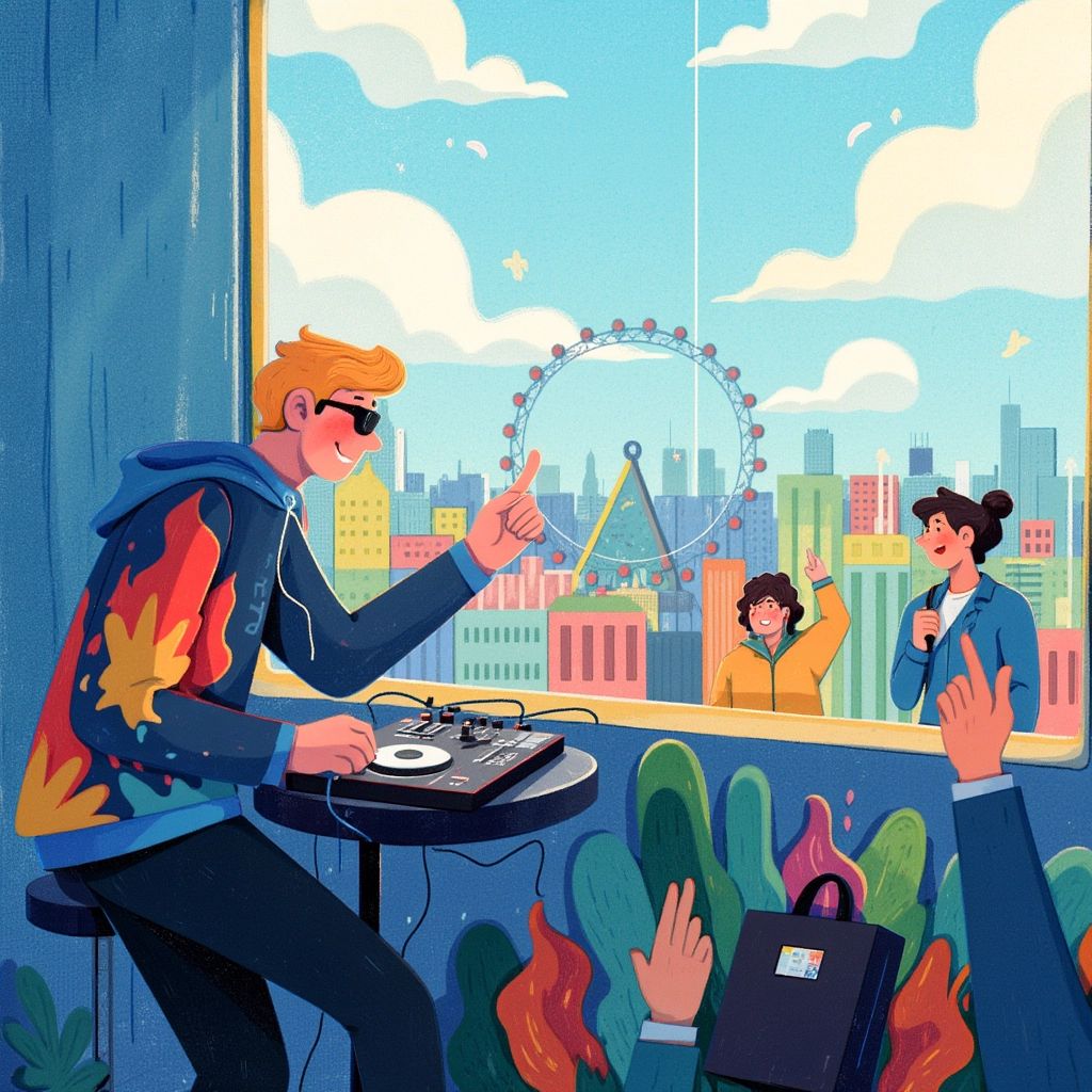 As they reached the top, [Tom](MYX7MZ64) played some tunes on his portable DJ set. 'This city looks even cooler from up here!' he grinned.