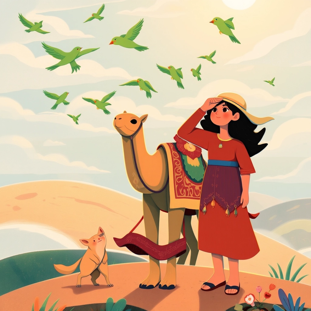 While exploring, they overheard the cheerful chirps of birds. Looking up, they saw bright green parrots flying above, an unusual sight in the desert. ‘They must be from the oasis!’ [Amal](S74524Q2) exclaimed.