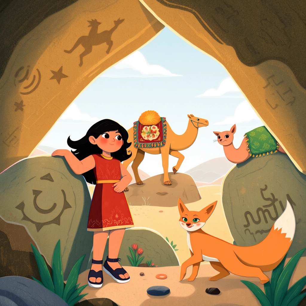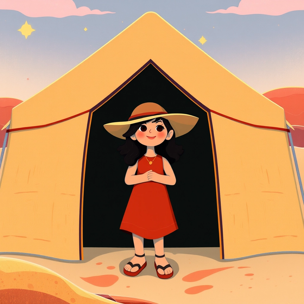 It was a sunny morning in the heart of Saudi Arabia, where the desert sands shimmered like gold under the bright sunlight. [Amal](S74524Q2), a curious little girl in a red dress and a wide-brimmed sun hat, peeked out of her tent, excited for the day's adventure.