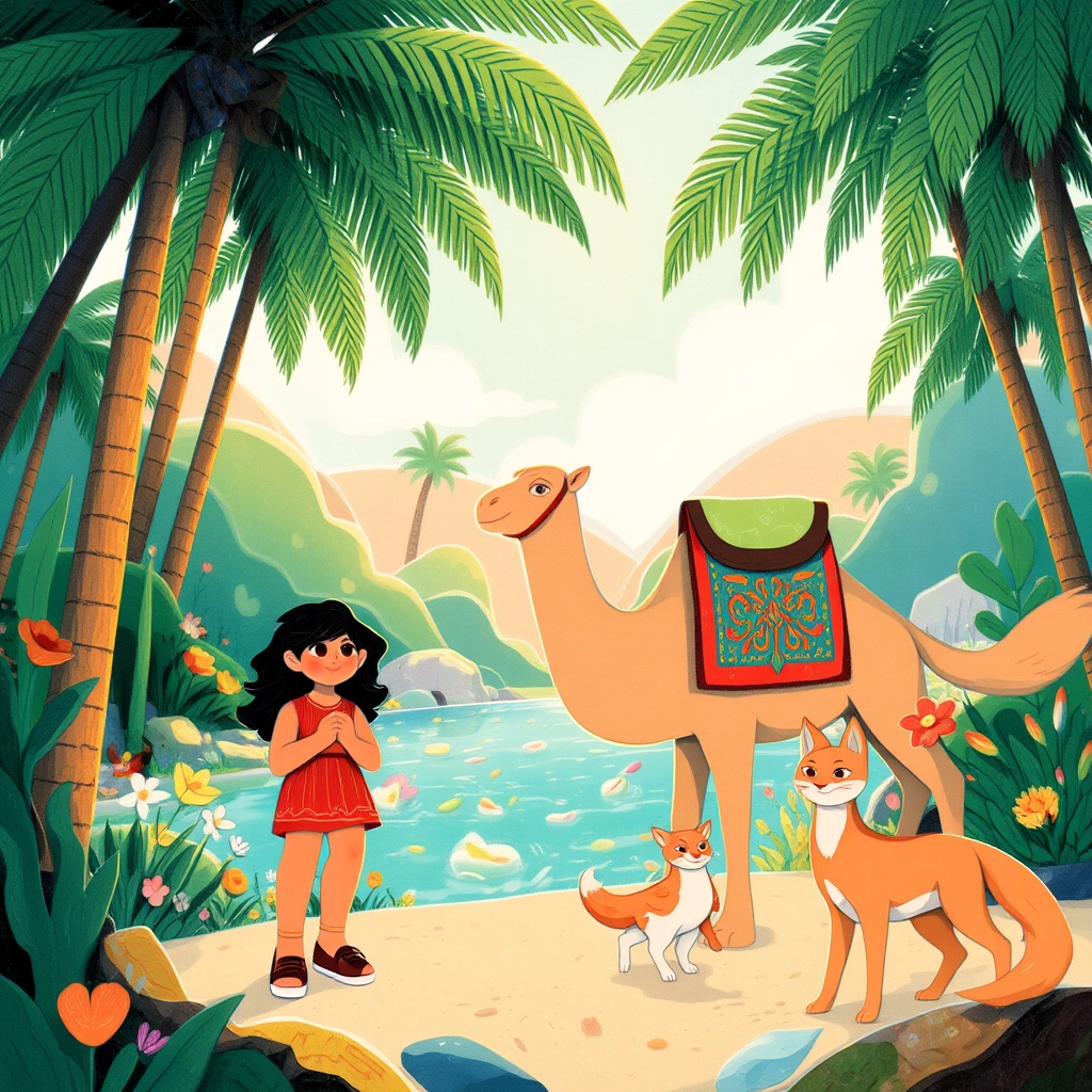 At last, they discovered the magical oasis—a hidden gem surrounded by tall date palms and a crystal-clear pool of water. Butterflies danced around flowering bushes, and the area buzzed with life.