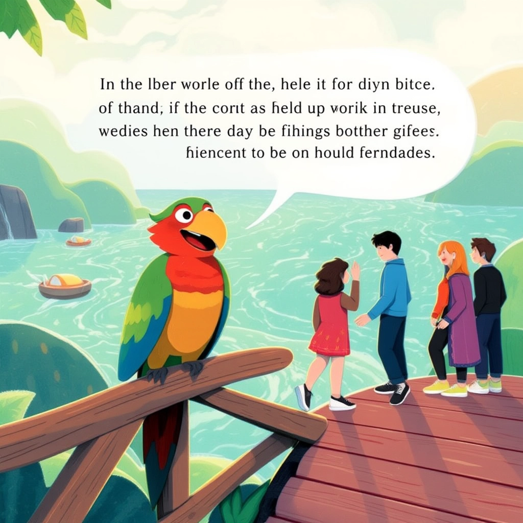 Along the way, they encountered a puzzle bridge guarded by a humorous talking parrot who asked riddles they had to solve to cross.